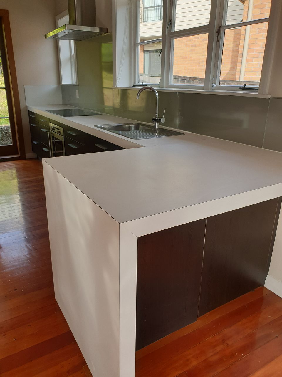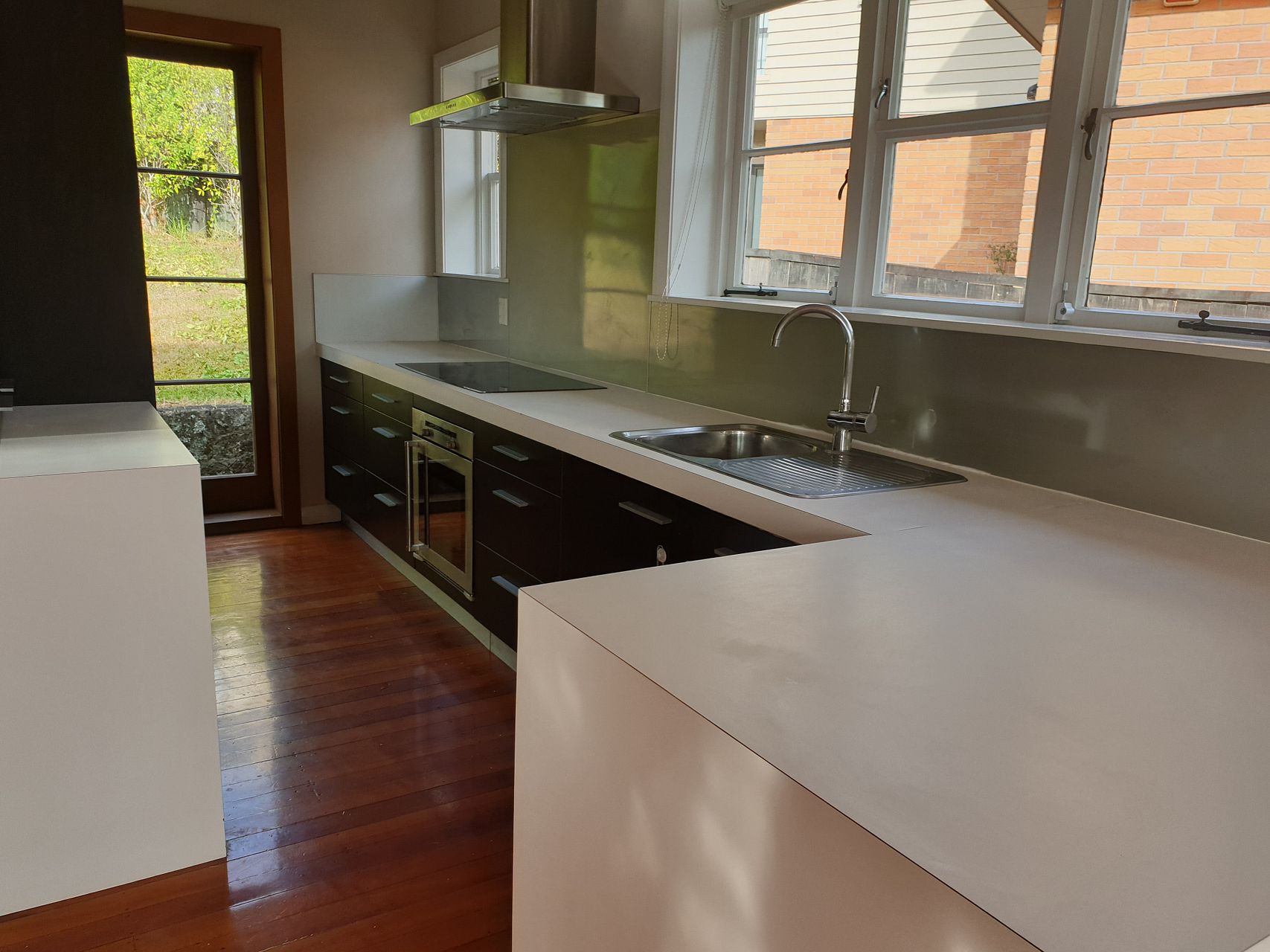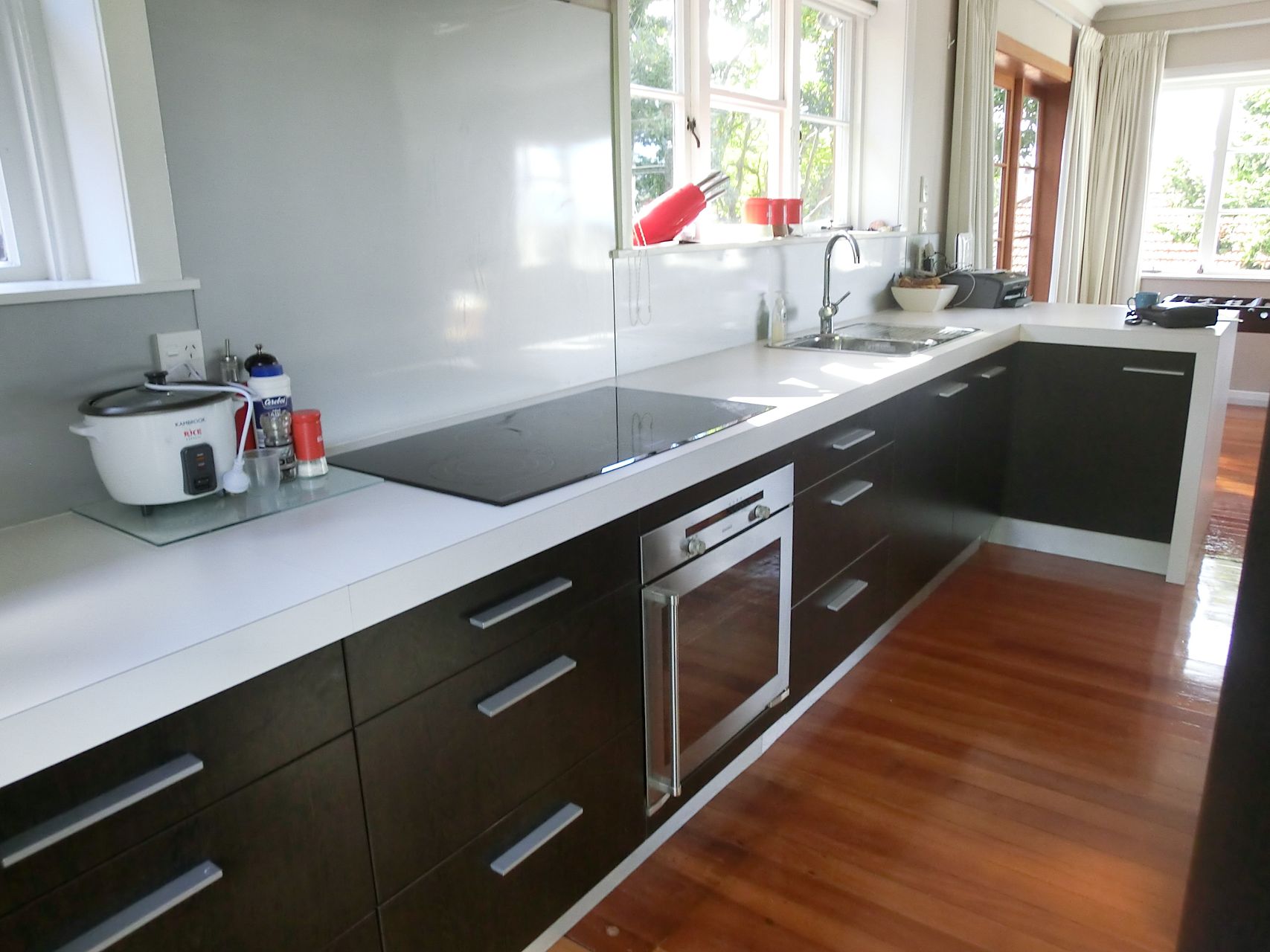 Large living area opens out with French Doors onto north-facing sunny deck. Lovely modern galley kitchen. Huge set of living area windows slightly elevated enhances feeling of openness and space.