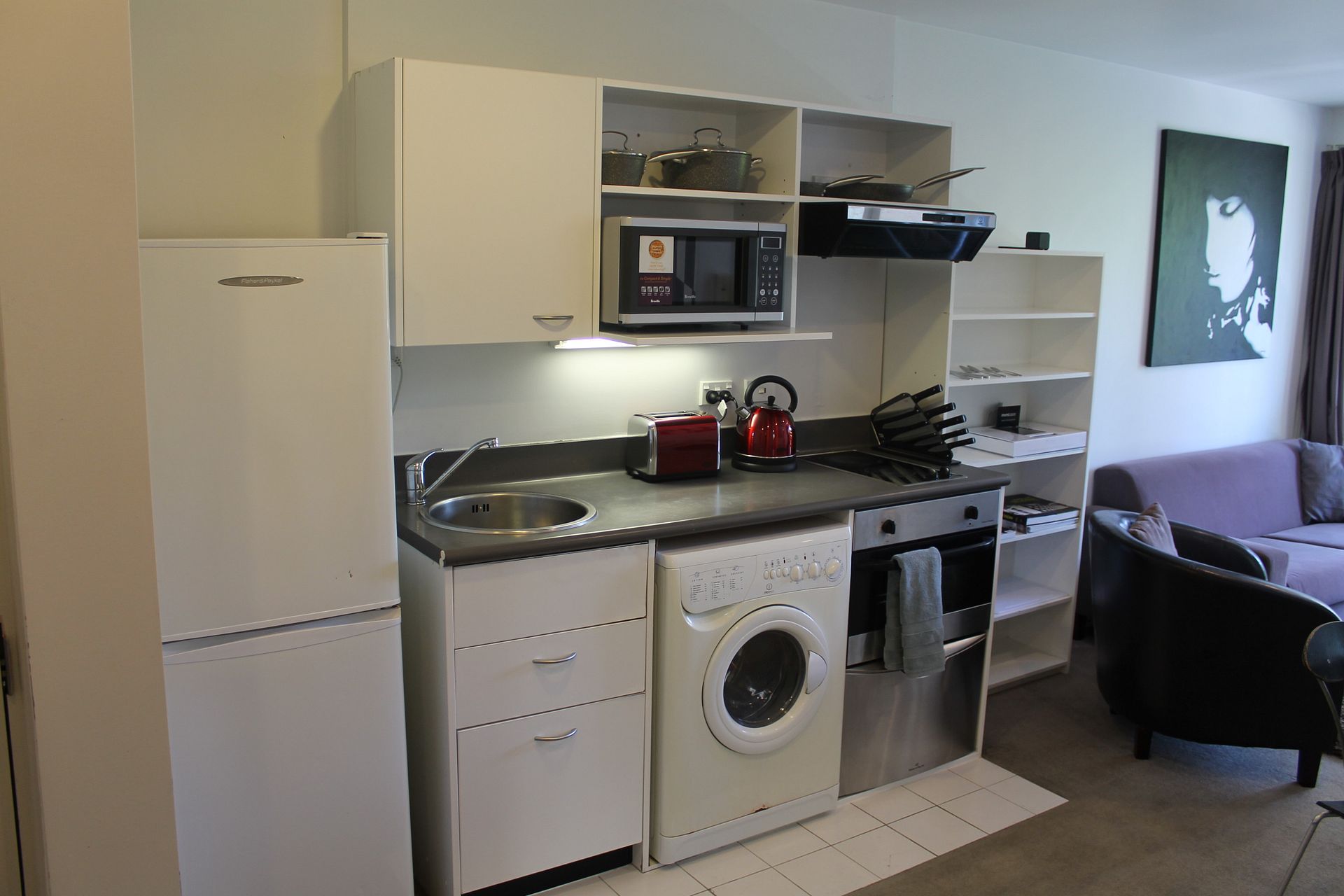 Apartment comes with: oven, hob, microwave, fridge/freezer, washing machine.