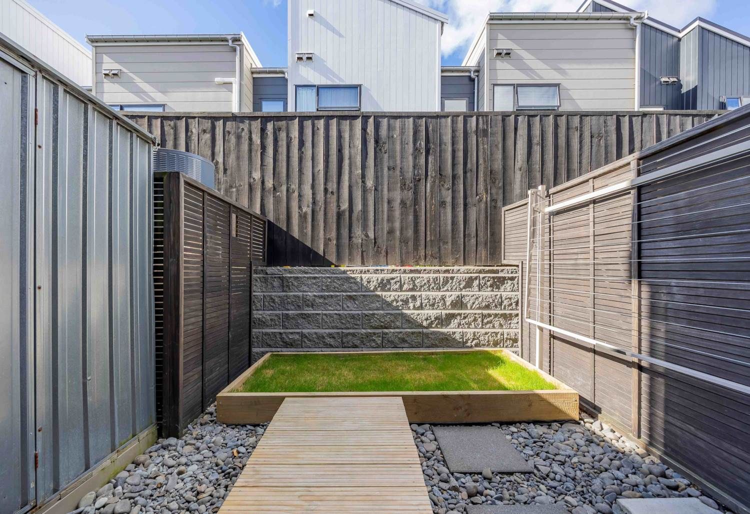 Outdoor Space: A private, low-maintenance backyard with a small garden and a mini deck.