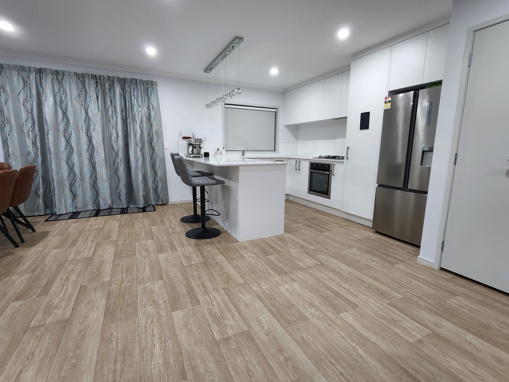 Modern Kitchen: Equipped with stainless steel appliances, engineered stone countertops, and ample cabinet space.