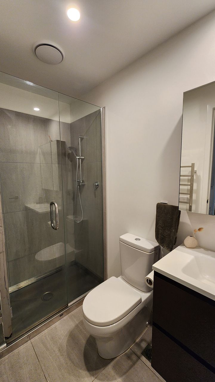 Bathroom includes a large vanity and drawers which provide plenty of storage and utilise the space well. A large stainless steel shower, caddy and a heated towel rail.