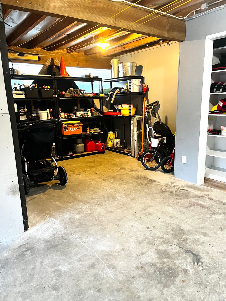 - 1 car garage with plenty of storage space (includes 2 x shelving units to use)