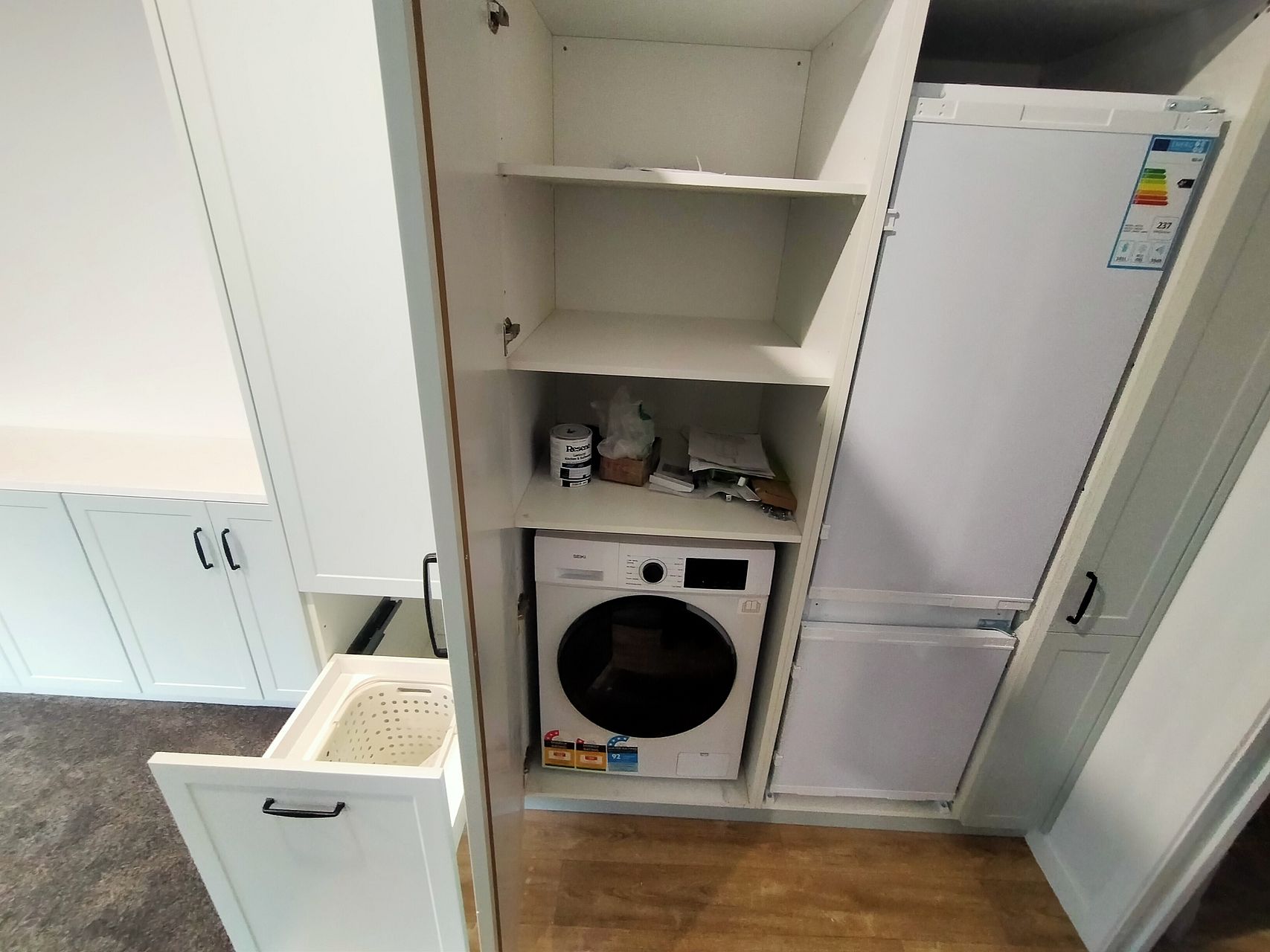 The layout makes great use of the space, with extensive built-in storage and fully equipped with brand new fridge/freezer, dishwasher and washing machine. Heating is via heatpump and it is mostly double glazed.