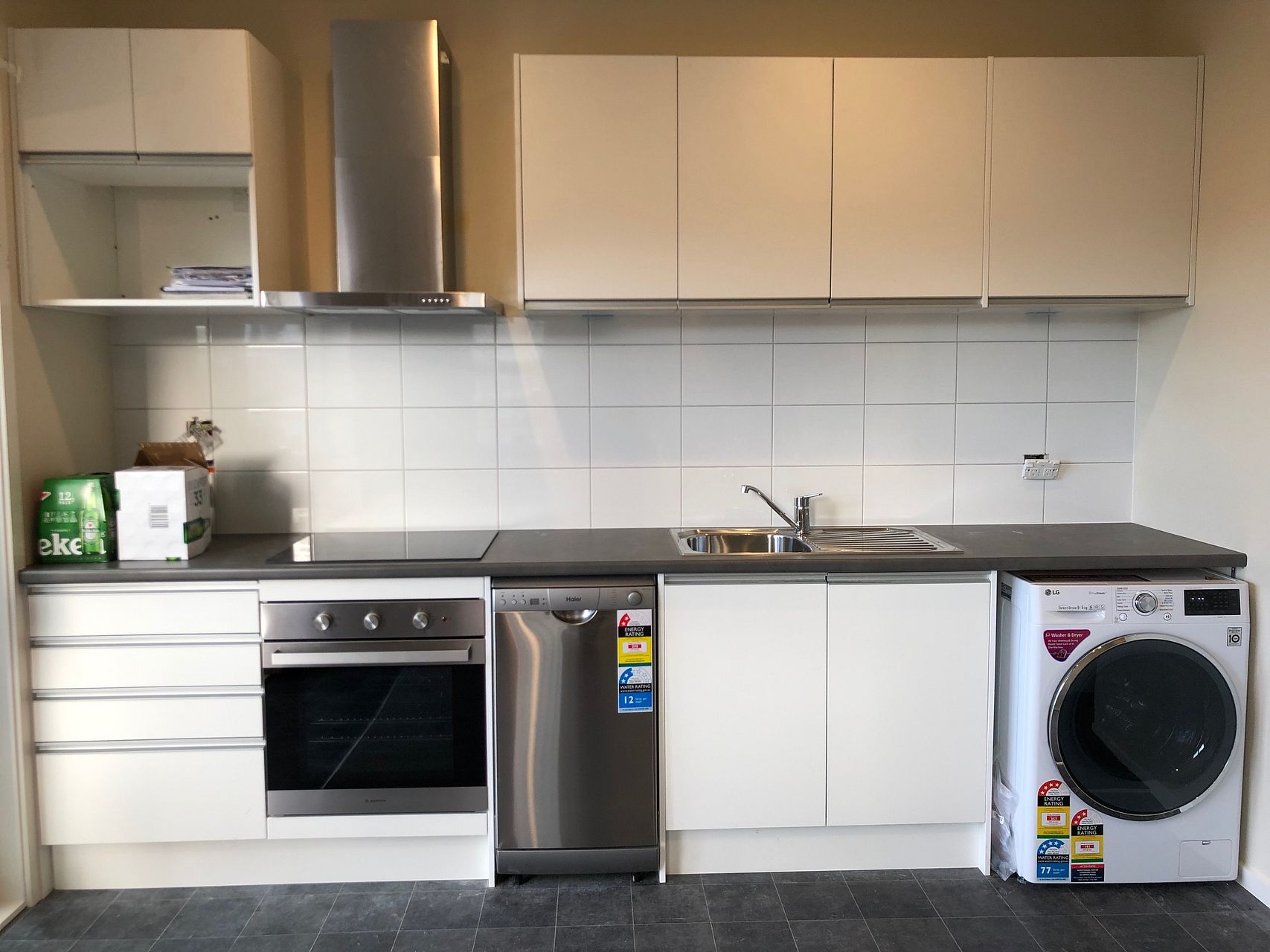 full kitchen with good cupboard and bench space. Dishwasher, Oven, Rangehood, Fridge, combo washer/dryer included. There is a big balcony with views of Wellington City.