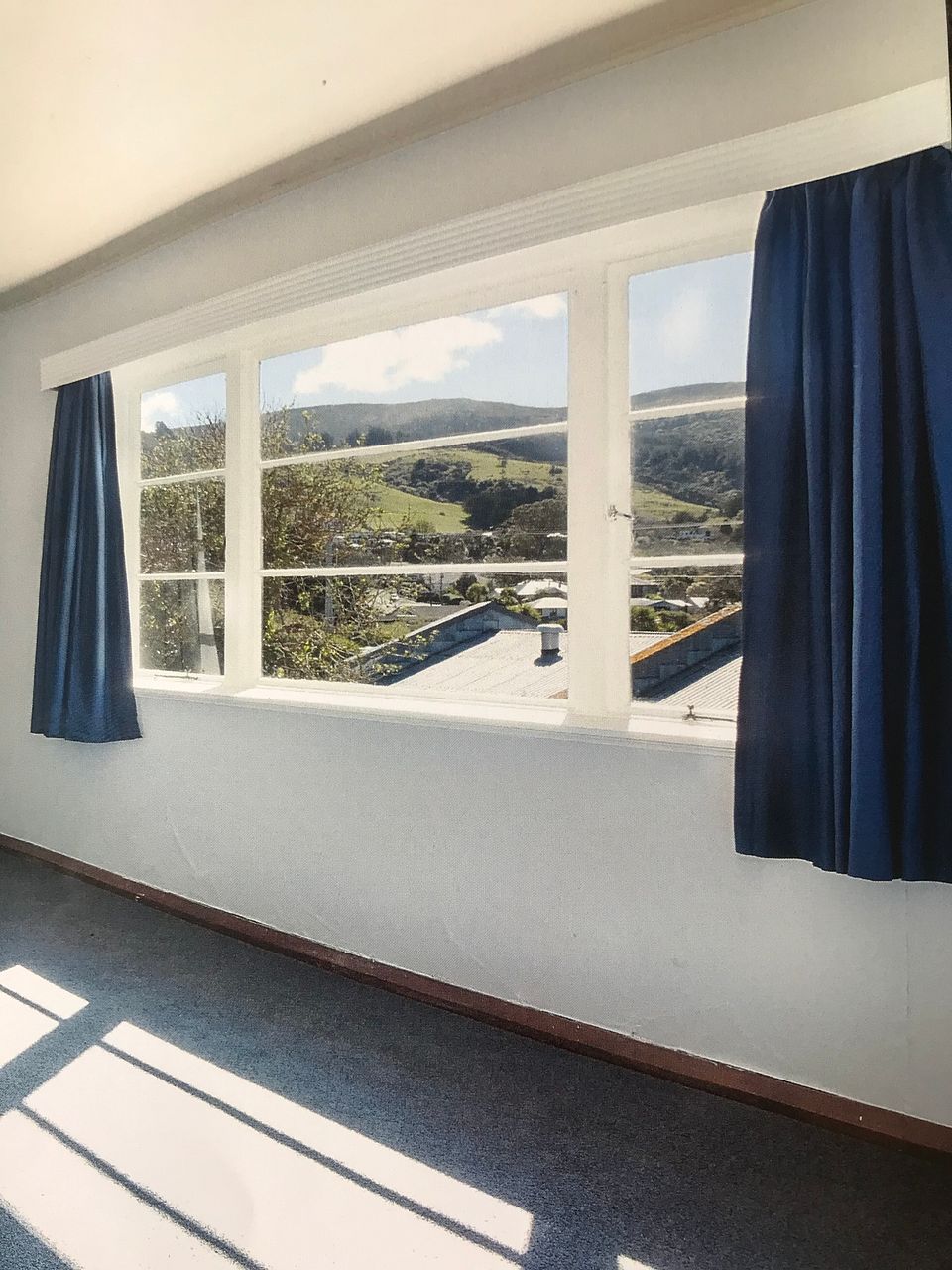 Spacious living dining kitchen with new carpet and curtains.