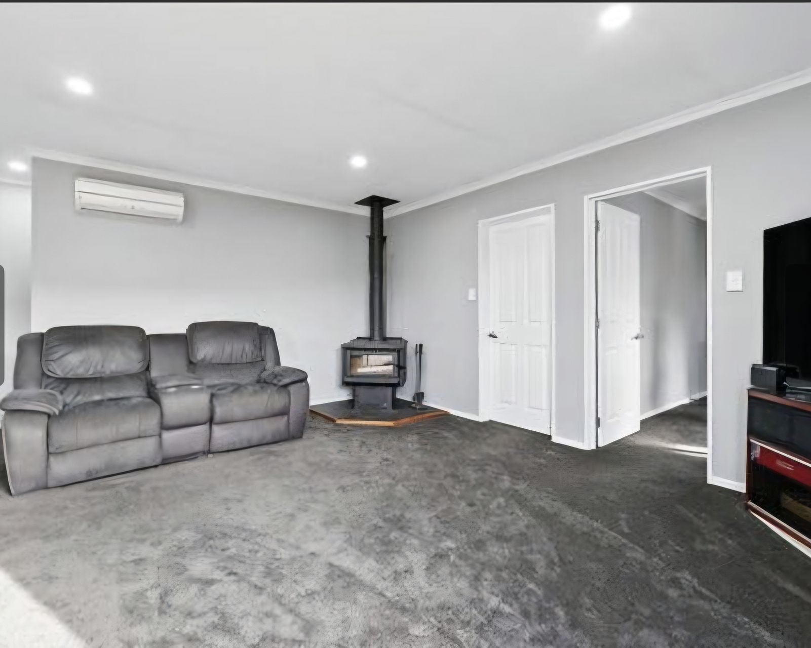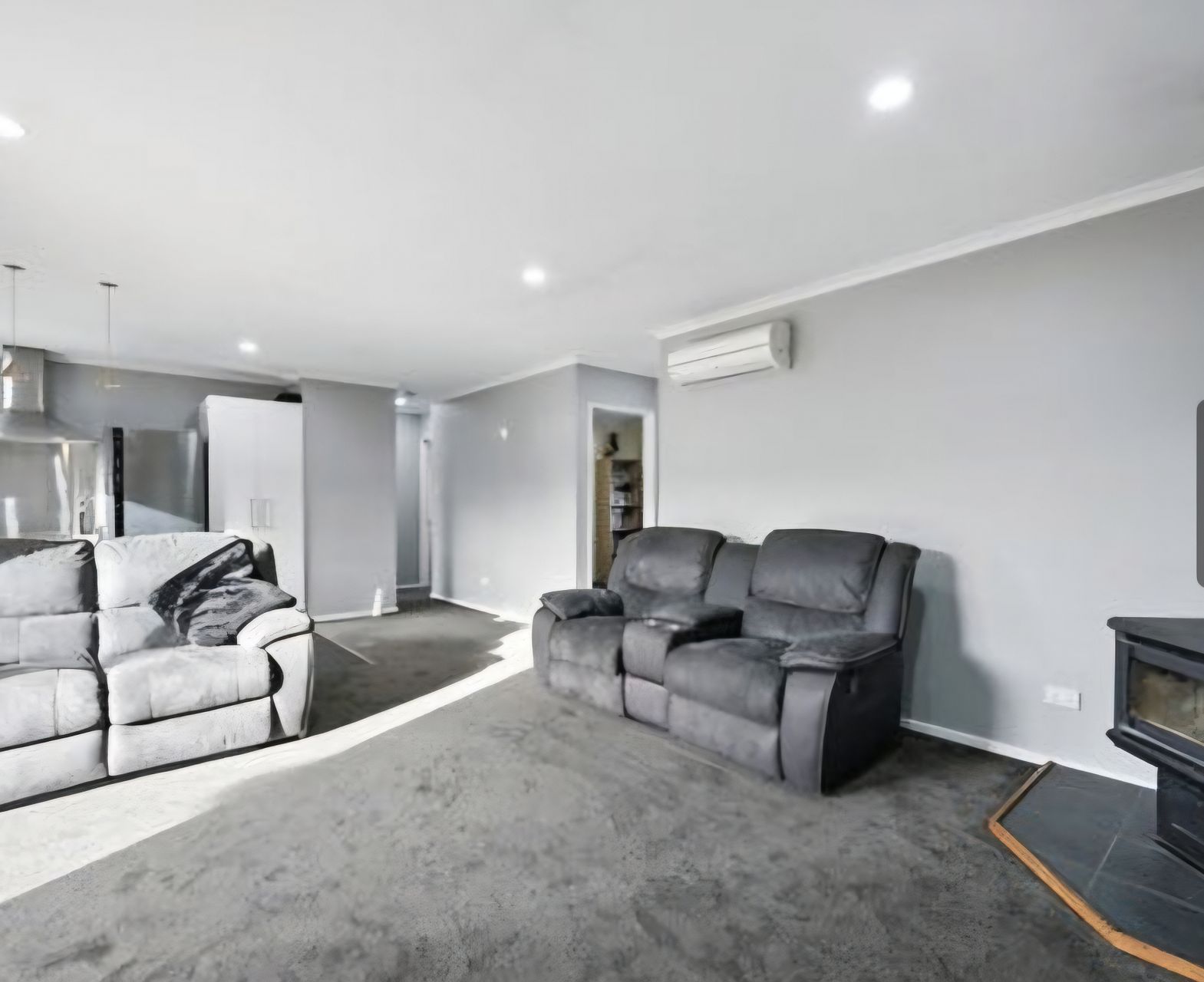 Cozy fireplace plus heat pump for year-round comfort