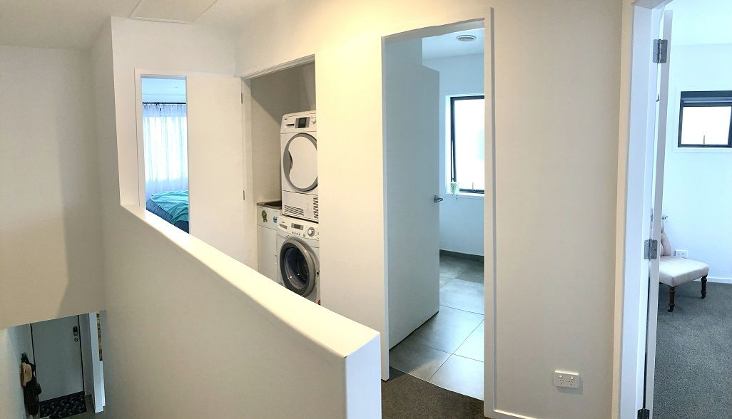 Upstairs has two large double bedrooms fitted with blackout shades and generous wardrobes, a spacious tiled bathroom and separate laundry cupboard with supertub.