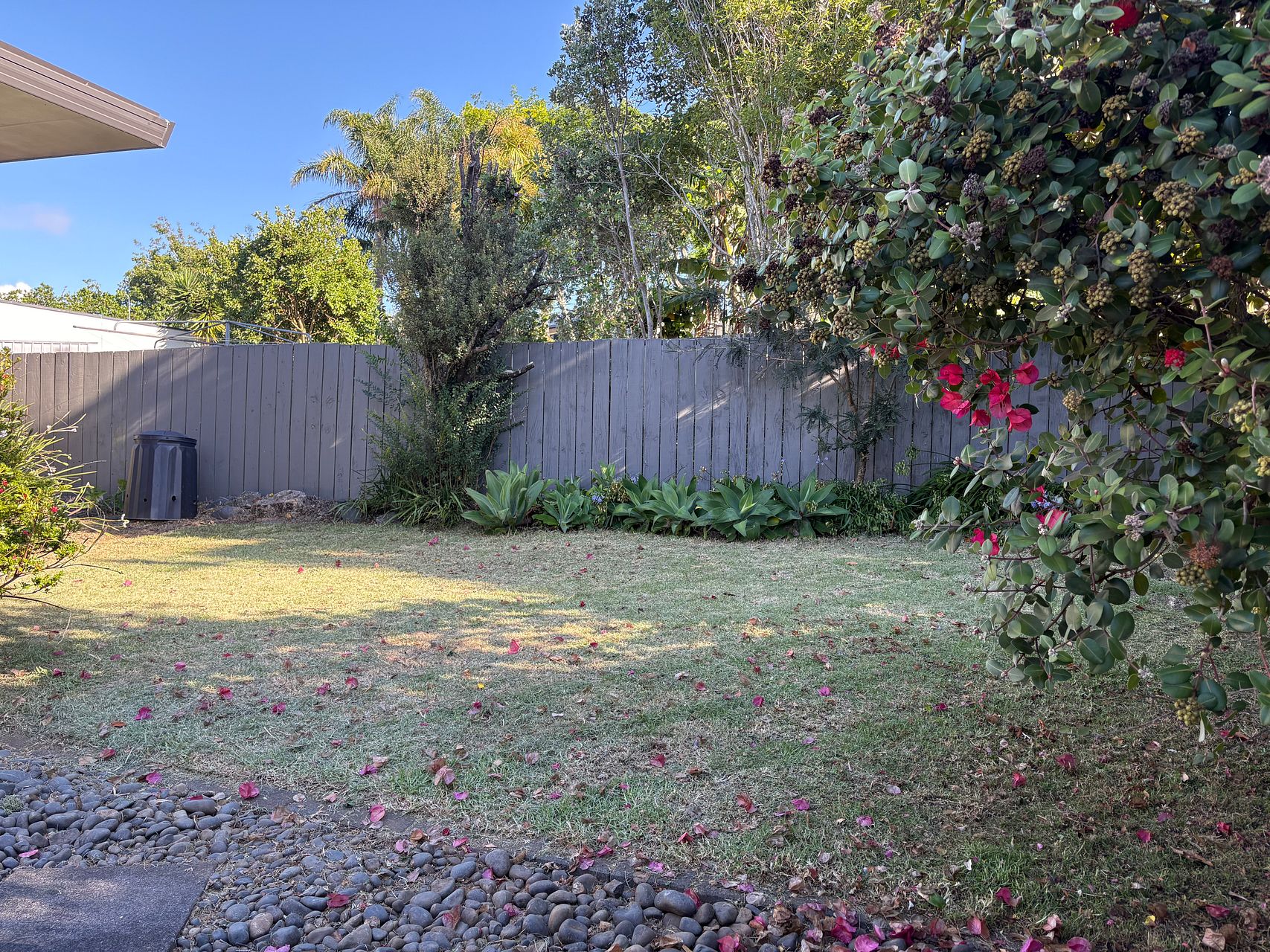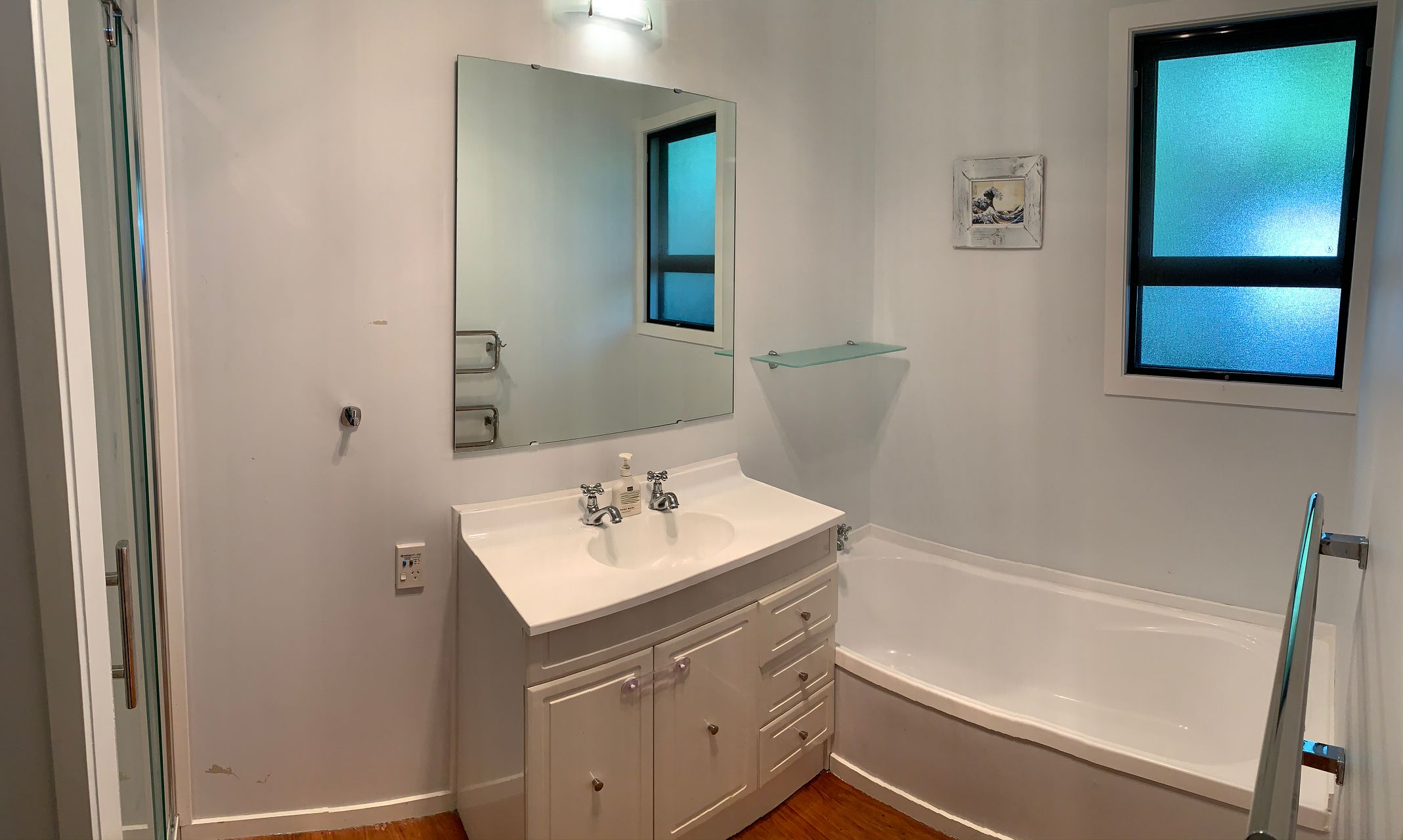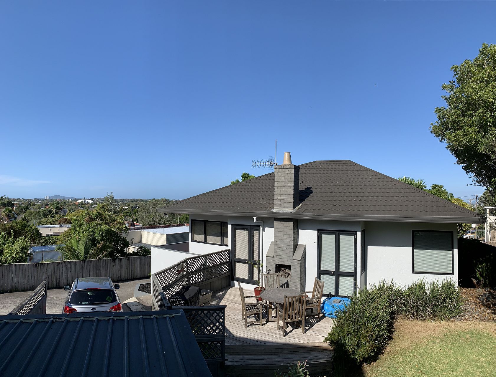 The driveway is shared with one neighbour, with an electronic gate regulating access to both properties. There is a single garage and one additional off-street carpark, and plenty of storage space within and under the house.