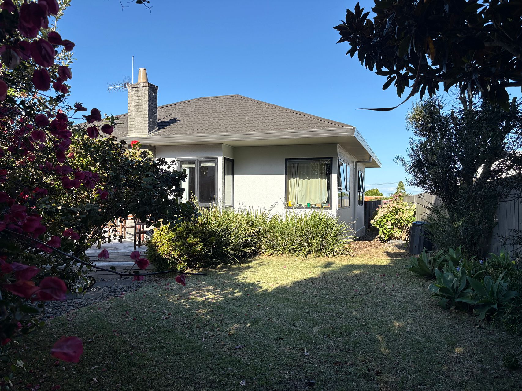 The open plan living and dining area basks in all day sun, and flows out to a deck and pleasant fully-fenced back garden. The well-appointed kitchen comes with a Bosch induction cooktop, a Miele oven and a Fisher and Paykel dishwasher.