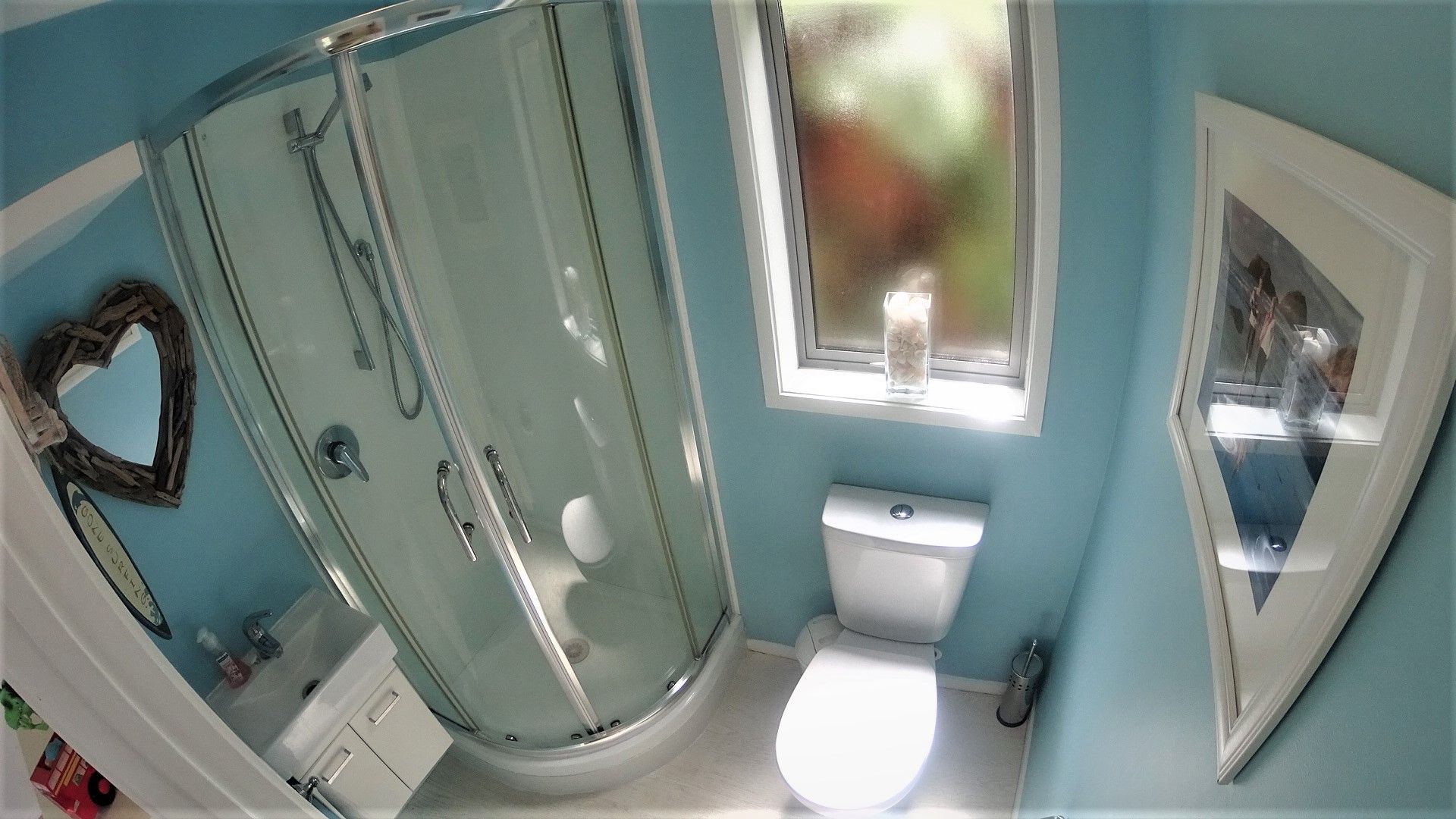Large family bathroom with a deep bathtub and oversized shower offering excellent water pressure.