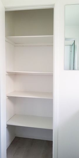Bathroom: Glass enclosed shower, shower dome, heated towel rail, double power point, extractor fan, gas hot water and large storage cupboard. **Note: No bath.**