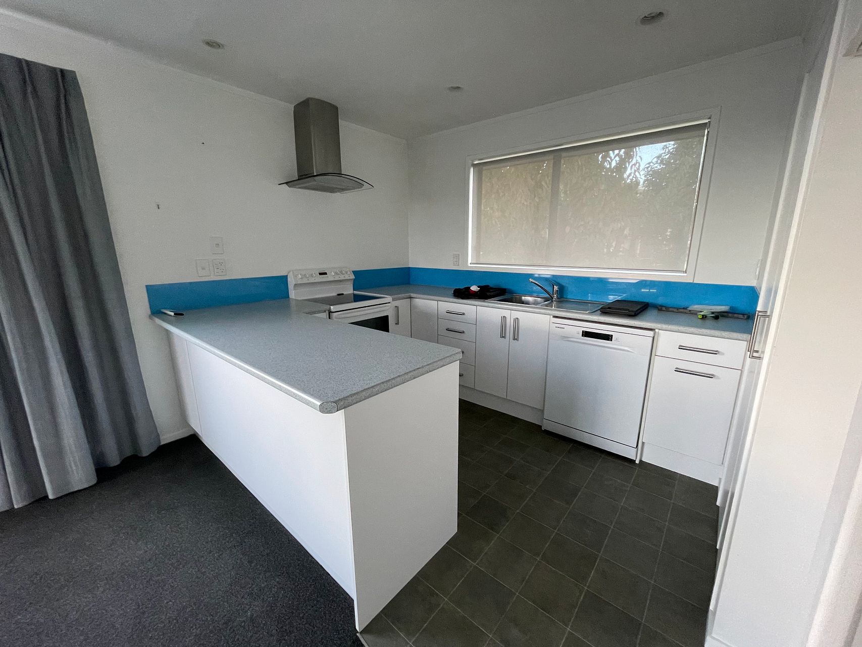 • Open-plan kitchen with colourful touches and leafy outlook