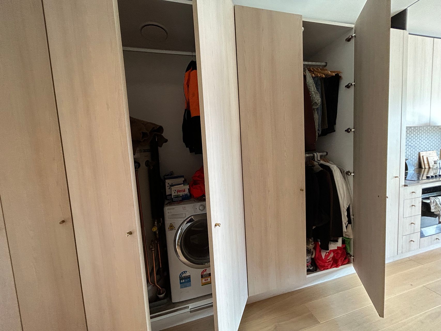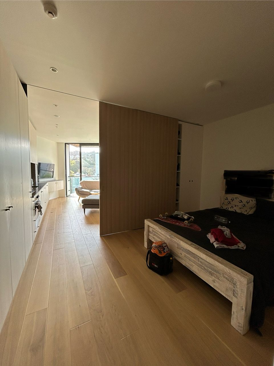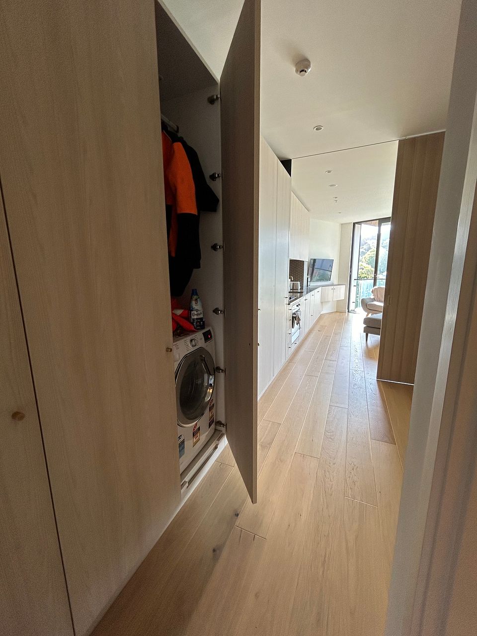 This one bedroom, one bathroom apartment has a lovely open plan kitchen and living area that falls nicely out onto the balcony. The tiled bathroom has a spacious walk in shower, heated towel rail and great shelving behind the mirrors. The bedroom fits a queen bed comfortably and has plenty of hidden storage.