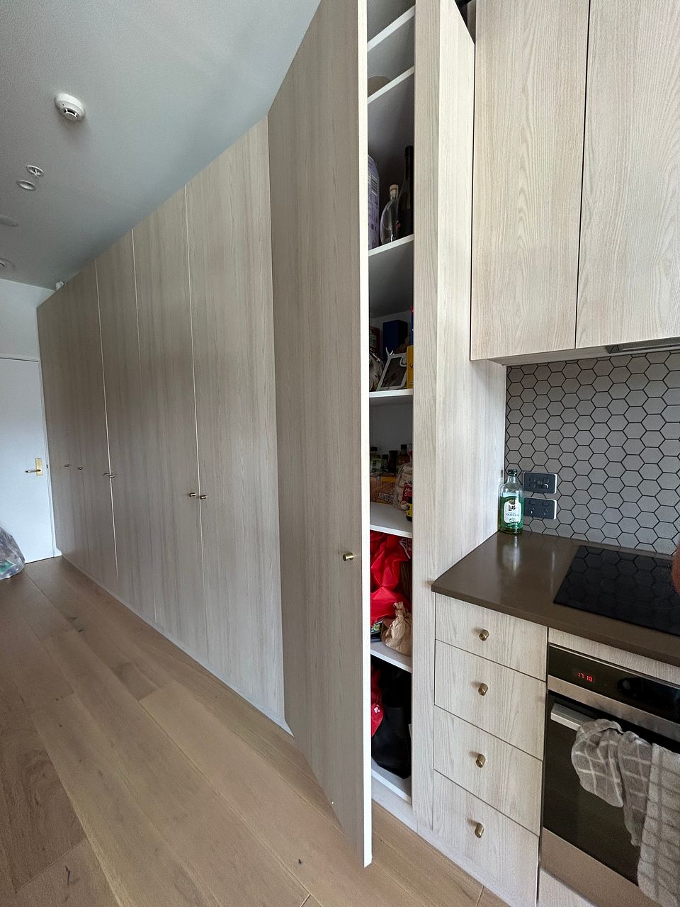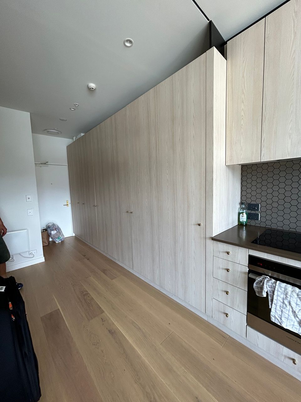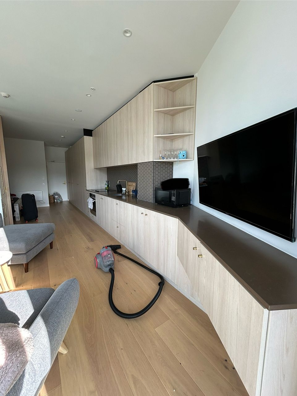 This one bedroom, one bathroom apartment has a lovely open plan kitchen and living area that falls nicely out onto the balcony. The tiled bathroom has a spacious walk in shower, heated towel rail and great shelving behind the mirrors. The bedroom fits a queen bed comfortably and has plenty of hidden storage.