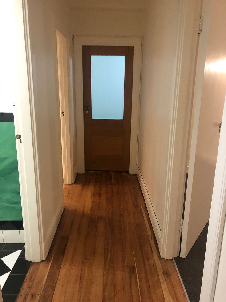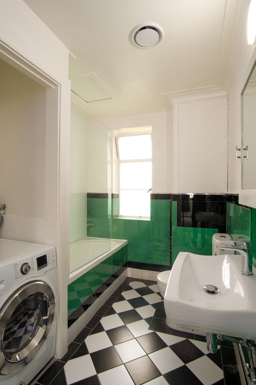 Classic Large tiled Deco bathroom: Opening Window, Bath & Shower, Heated towel rail. Laundry in Apt: Washer/Drier, Storage H/W Cupboard.