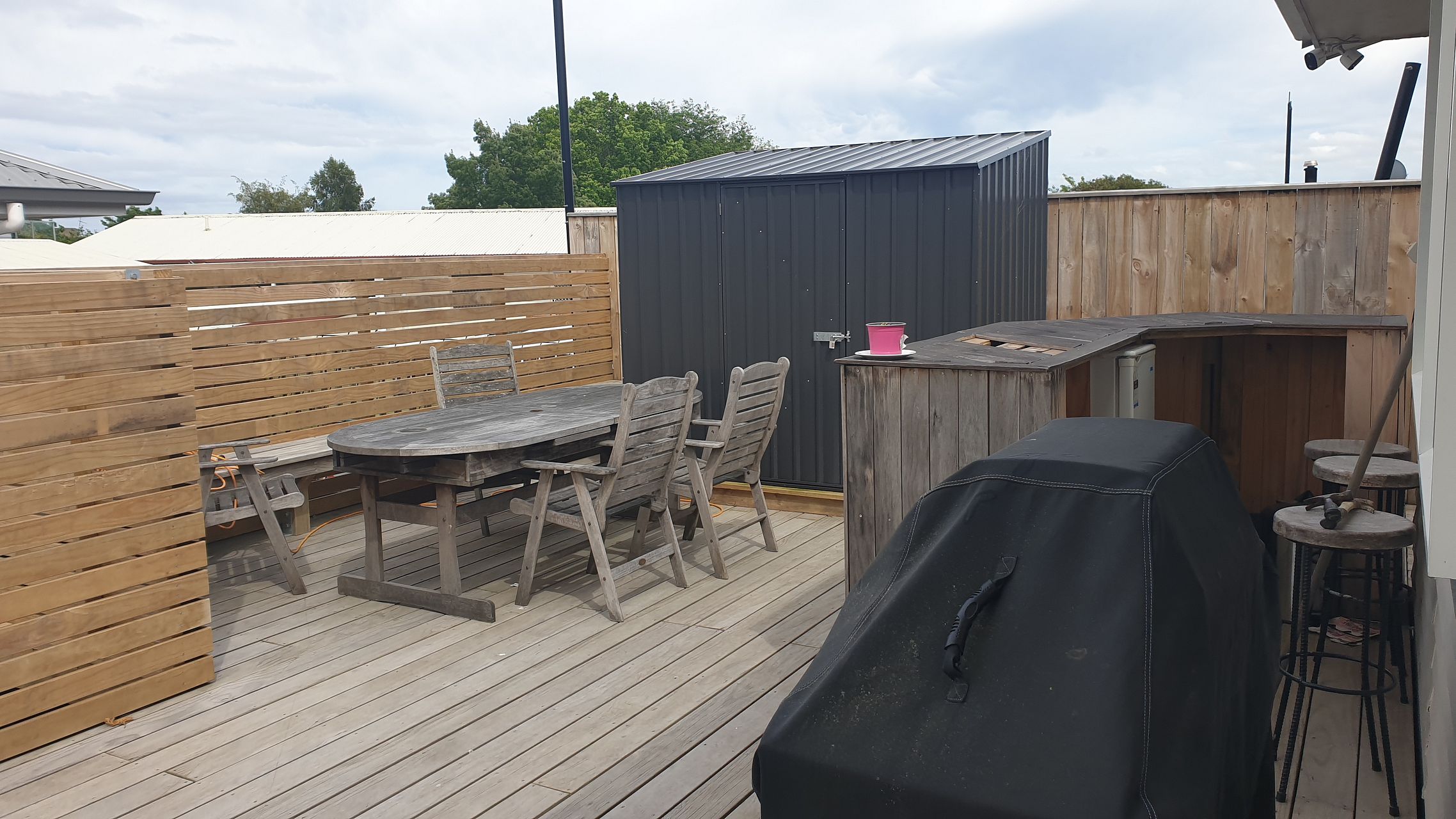 Please note the photo of the deck has a shed on the deck. The shed is for your use for storage and we will move it off the deck onto the concrete area once the concrete has finished setting.