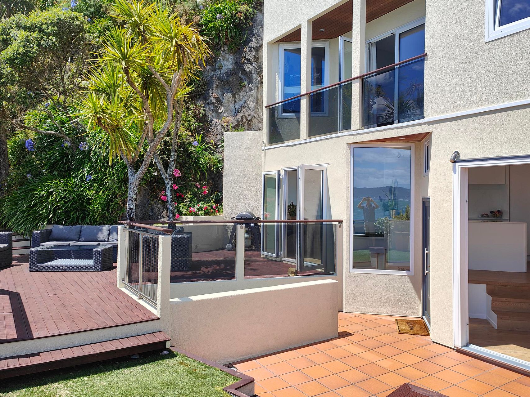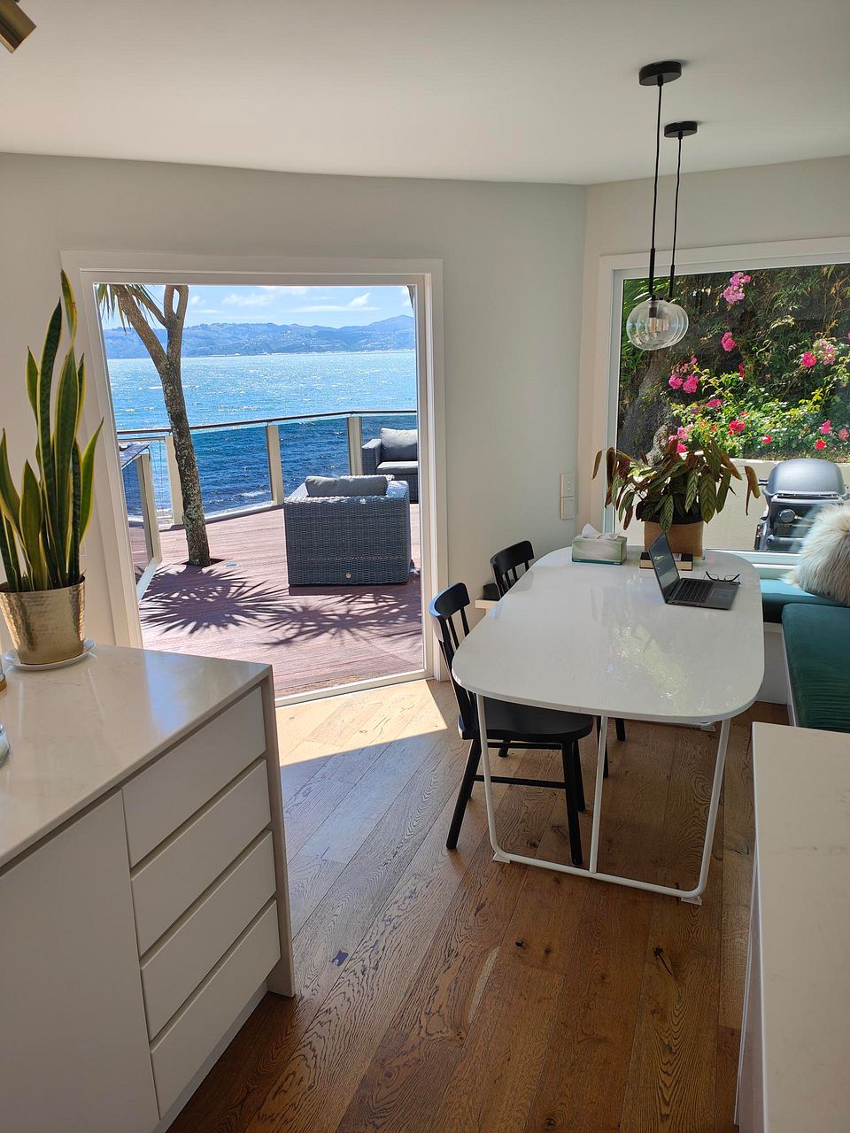 Fabulous panoramic views from every room or deck as you are literally on the water minutes to 5 cafes, 4 restaurants, 2 pubs and various schools, hiking, 2 x tennis and bowling clubs, sporting fields, a public swimming pool, shops and beaches (some dog friendly). The ultimate work from home location, or ride the ferry to work (25 minutes), take one of the many buses, or ride your bike or E-bike to the CBD on the newly built Tupua Horo Nuku and Te Ara Tupua shared pathways connecting Days Bay to the City and come home to your holiday resort every night. This property includes a completely private new roof top spa overlooking the harbour with 180 degree views for the ultimate in relaxation and star gazing. This area has the most sunlight hours across Wellington, and is on average 5 degrees warmer than the City, if not more in summer due to the various decks. The house is also sheltered from the prevailing winds, and is a warm place in winter with floor to ceiling triple glazed uPVC German made and imported windows and doors throughout, and is silent from any road noise as a result. This house has been beautifully renovated over recent years including the Italian tiled bathroom and open marble kitchen including all the latest European appliances e.g. Miele dish washer and Neff steam oven and induction etc. Includes two Heat pumps/Air Conditioners and an outdoor solar shower for using after swims in the sea. Freshly painted inside and out in recent months. Includes a large double garage with off street parking as well so room for 3 vehicles. Super energy efficient house that averages $200 to $300 a month in energy costs (based on family of 3), even through winter. Flexible start date and length of renting to the right people. Ideally a multi year period is preferred with weekly rental reductions from year 2 as a result. Furnished or not. This is the ultimate family, professional single or couple residency. Viewings available now.