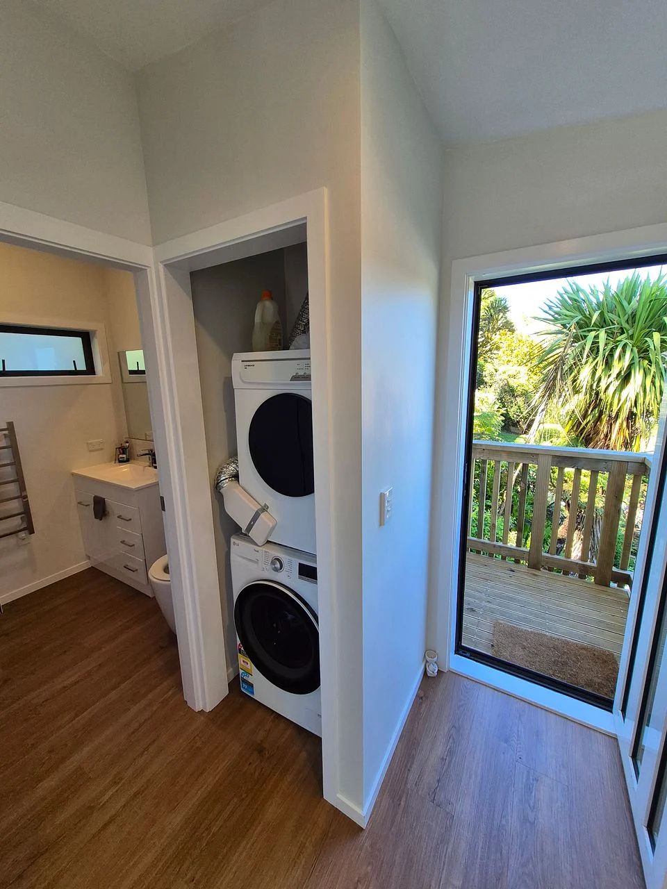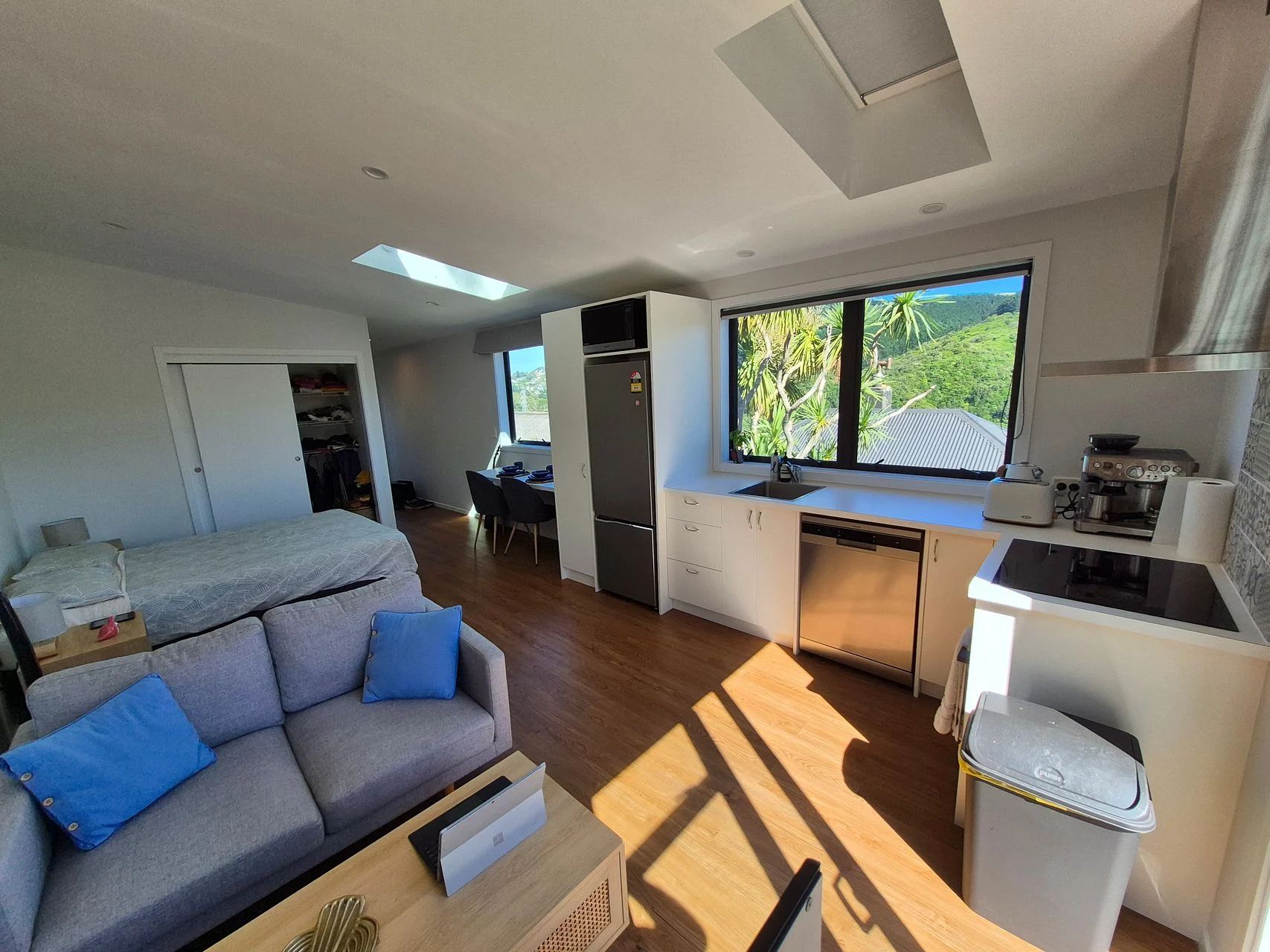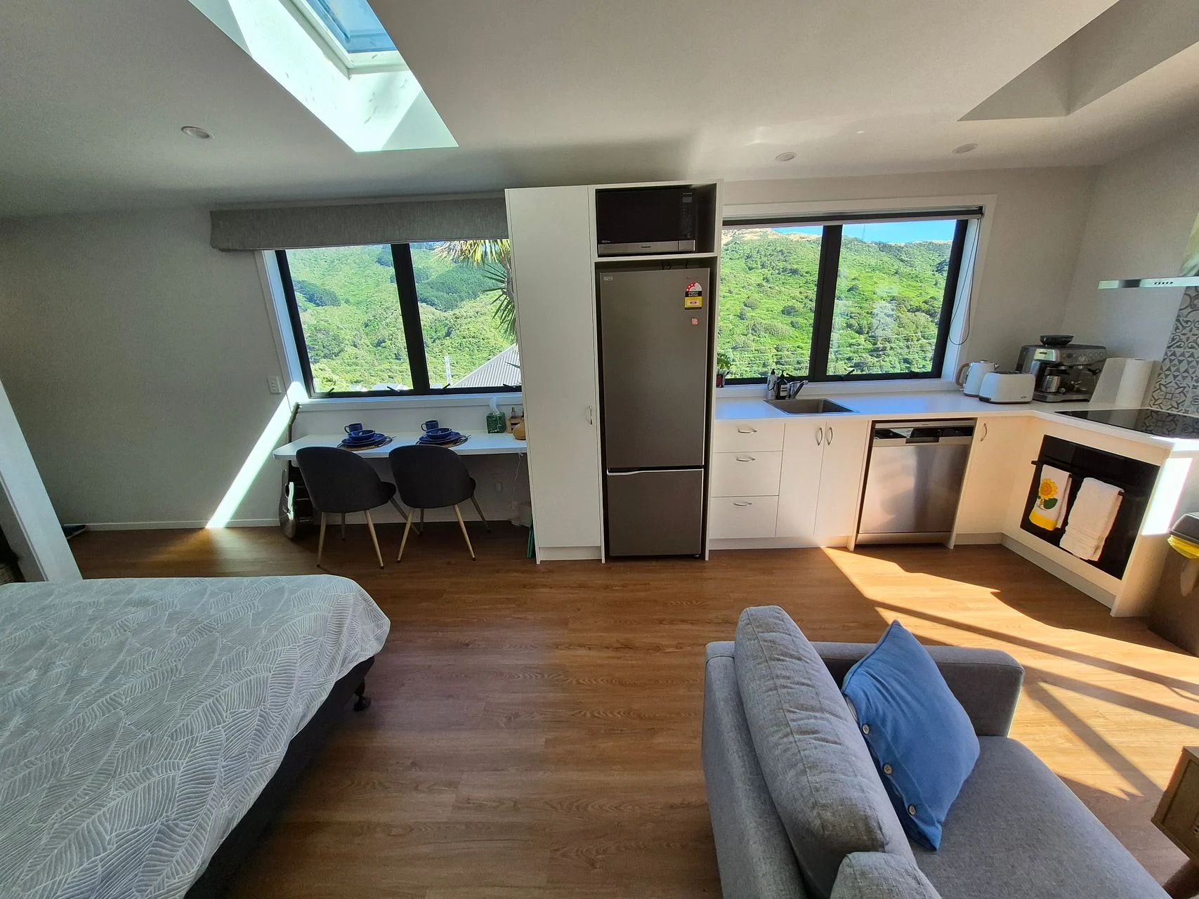 The house is fully furnished with modern appliances and bed, and has open plan living with stunning views, a large deck and fantastic sunny aspect and is only 50m from a bus stop for easy access to the cbd.