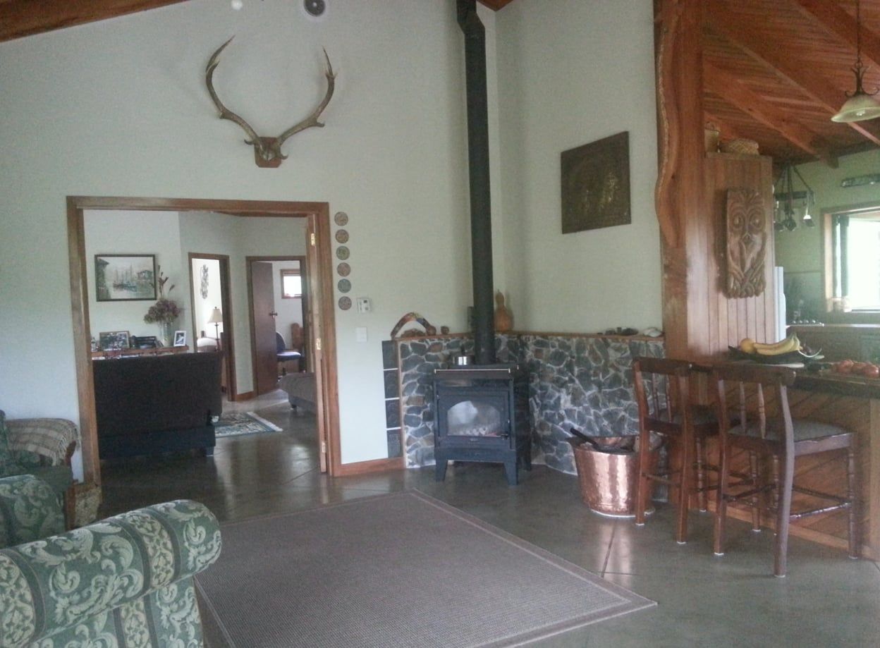 Fully insulated house blends in with its bush/farmland surroundings. Large open plan living, easy indoor outdoor flow onto covered decks. An efficient wood burner with wetback hot water heating. A heat transfer pump moves heat to other parts of the house. Master bedroom has ensuite. This is a hands on property with easy care lawns and garden, also, 4 small fenced paddocks available and pets negotiable.