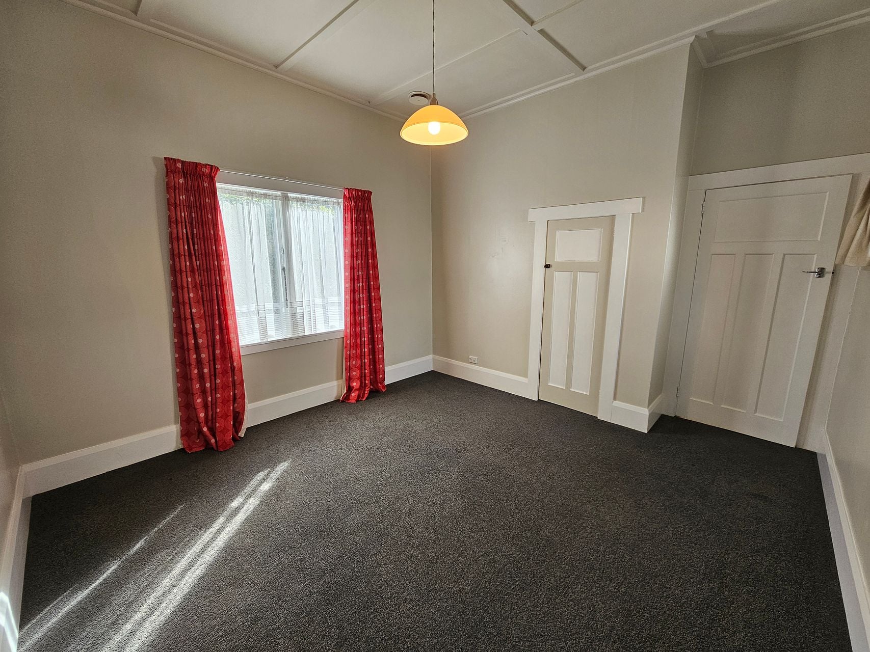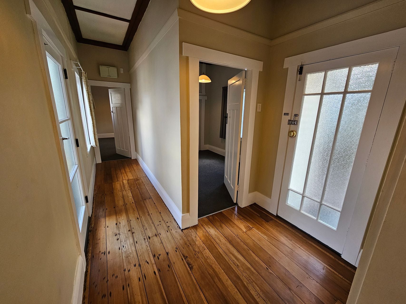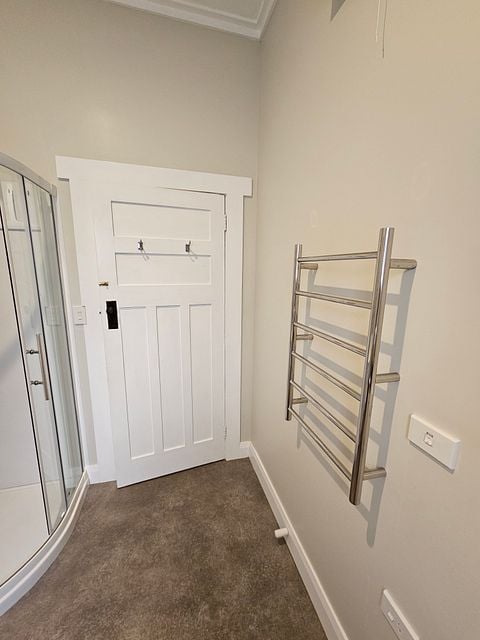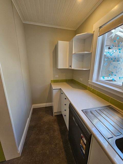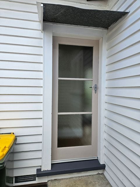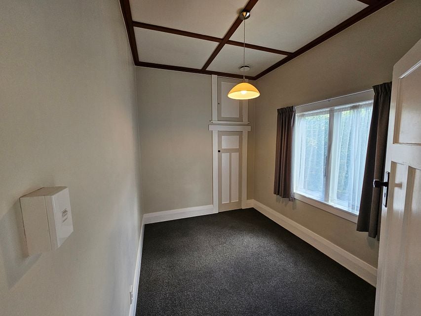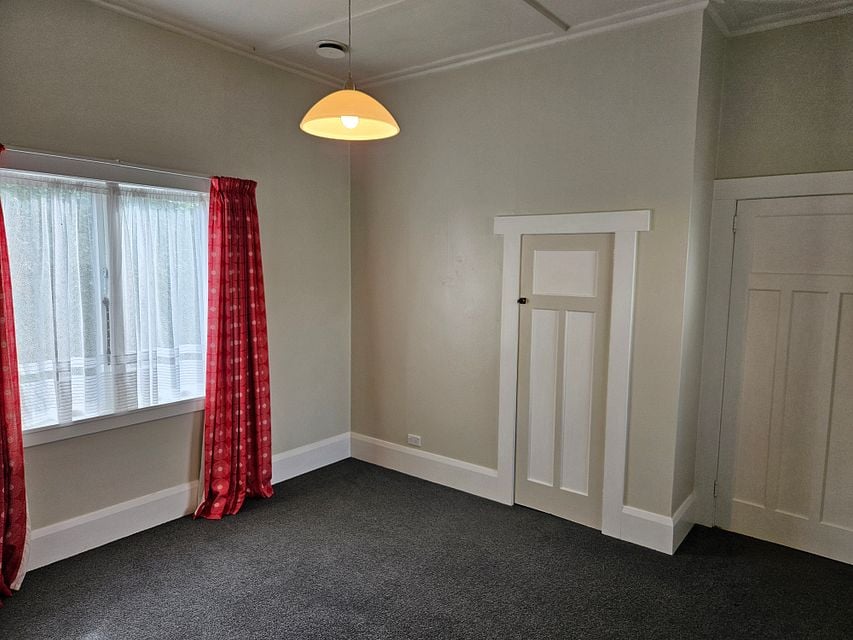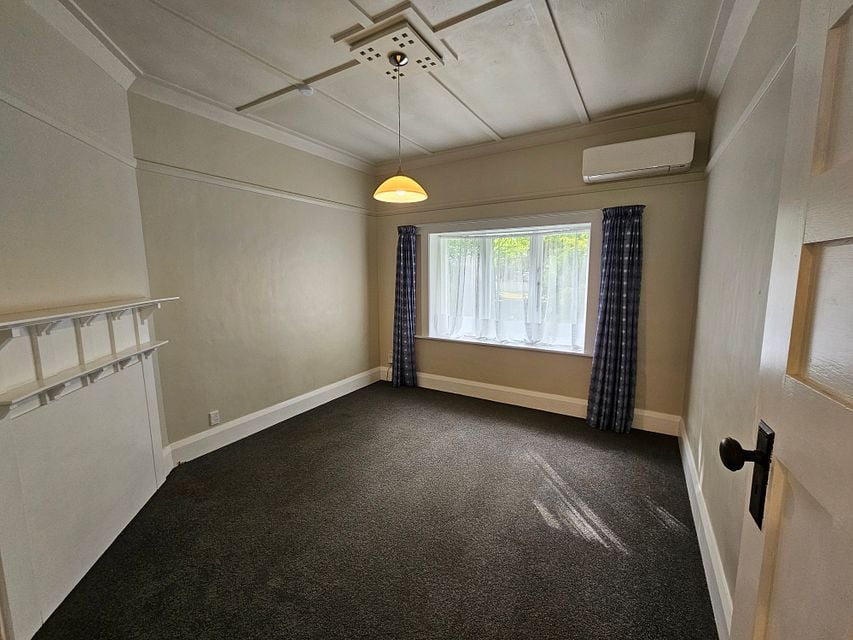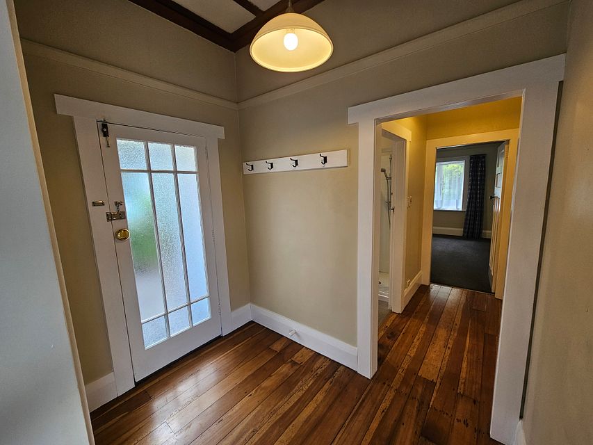 Front door comes off the side of the house adjacent to a shared driveway that leads to a block of 6 units and an off-street carpark. Two good sized bedrooms come off an L-shaped hallway with polished wooden floors. Both bedrooms are carpeted with built in wardrobes and double glazing on west-facing windows.