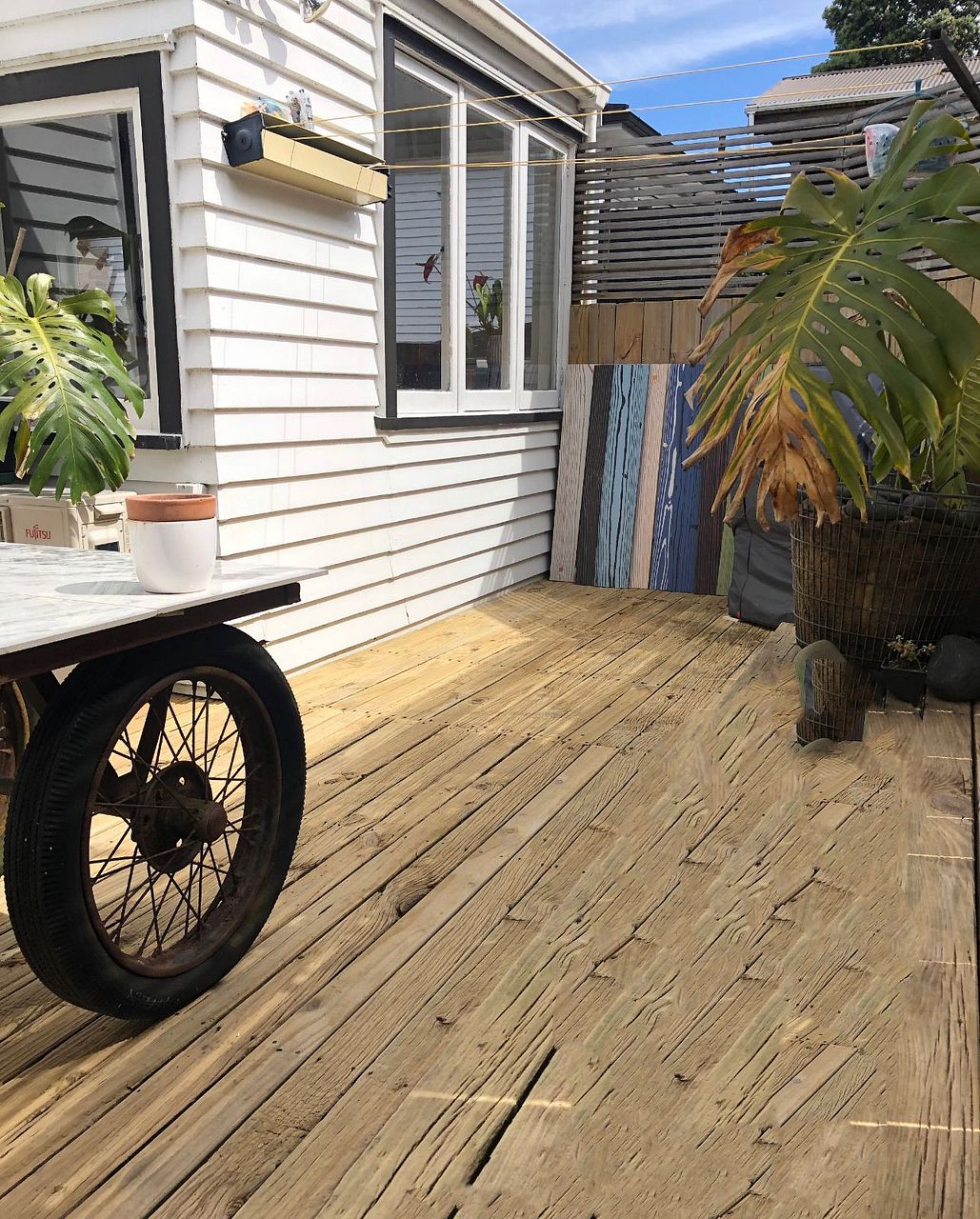 Th property is on two levels : Upstairs has three bedrooms, bathroom, kitchen, lounge and deck. Downstairs has two bedrooms, longe and bathroom.