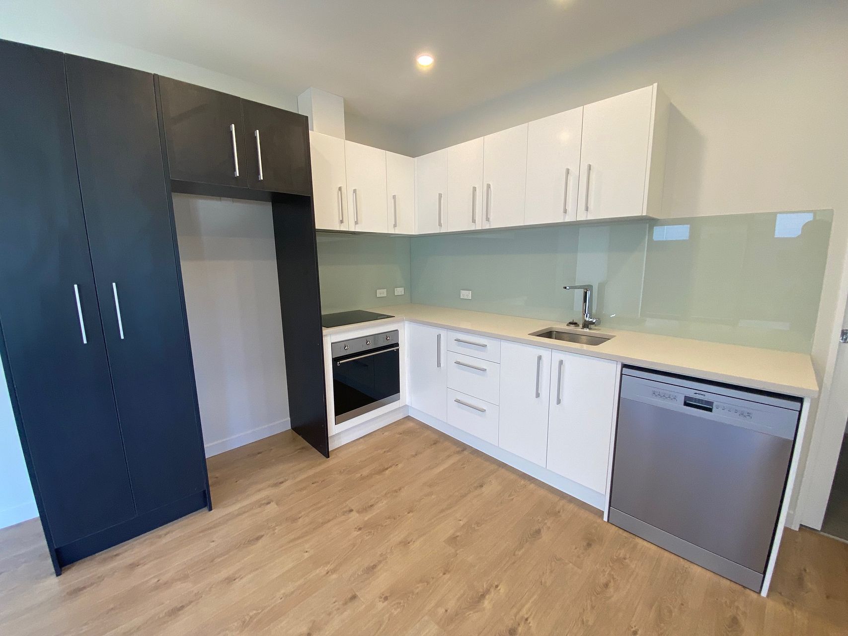 Kitchen kitted out with modern appliances, including induction stove top, wall oven and dishwasher.