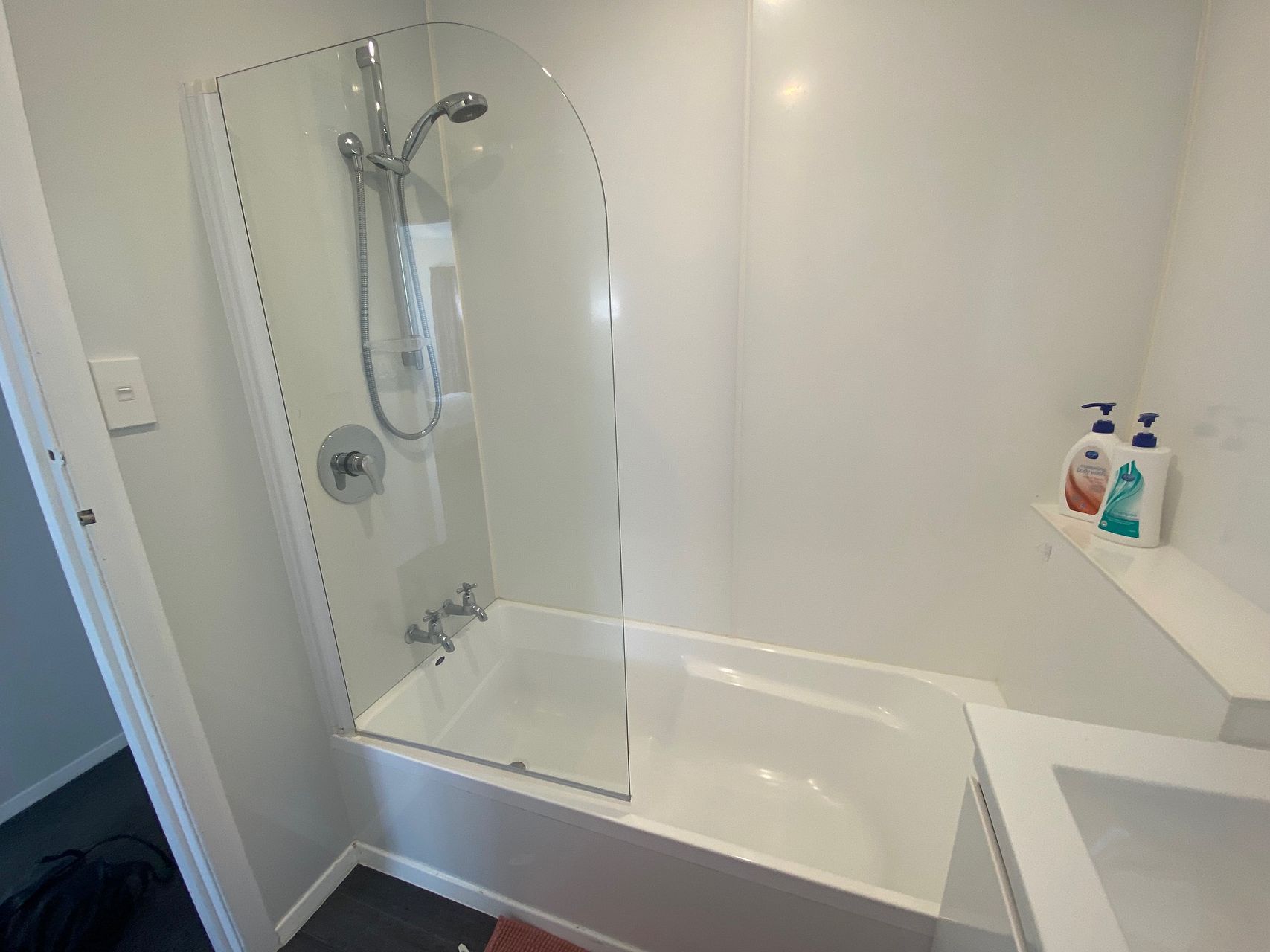 -Modern bathroom with shower over bath and a double glazed window