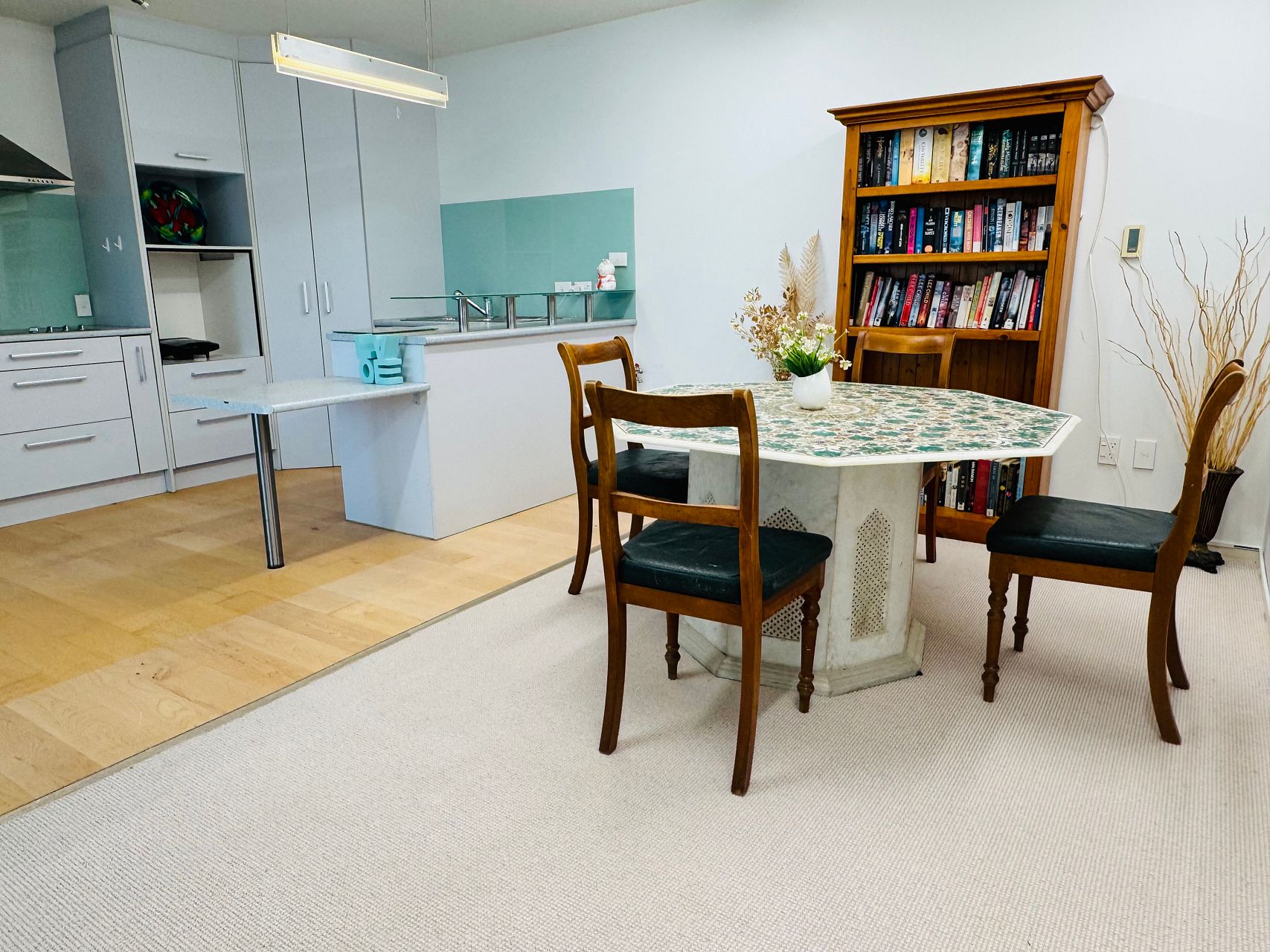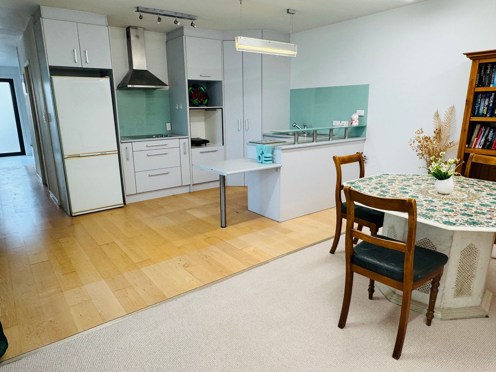 Open-plan living, dining, and kitchen area.
