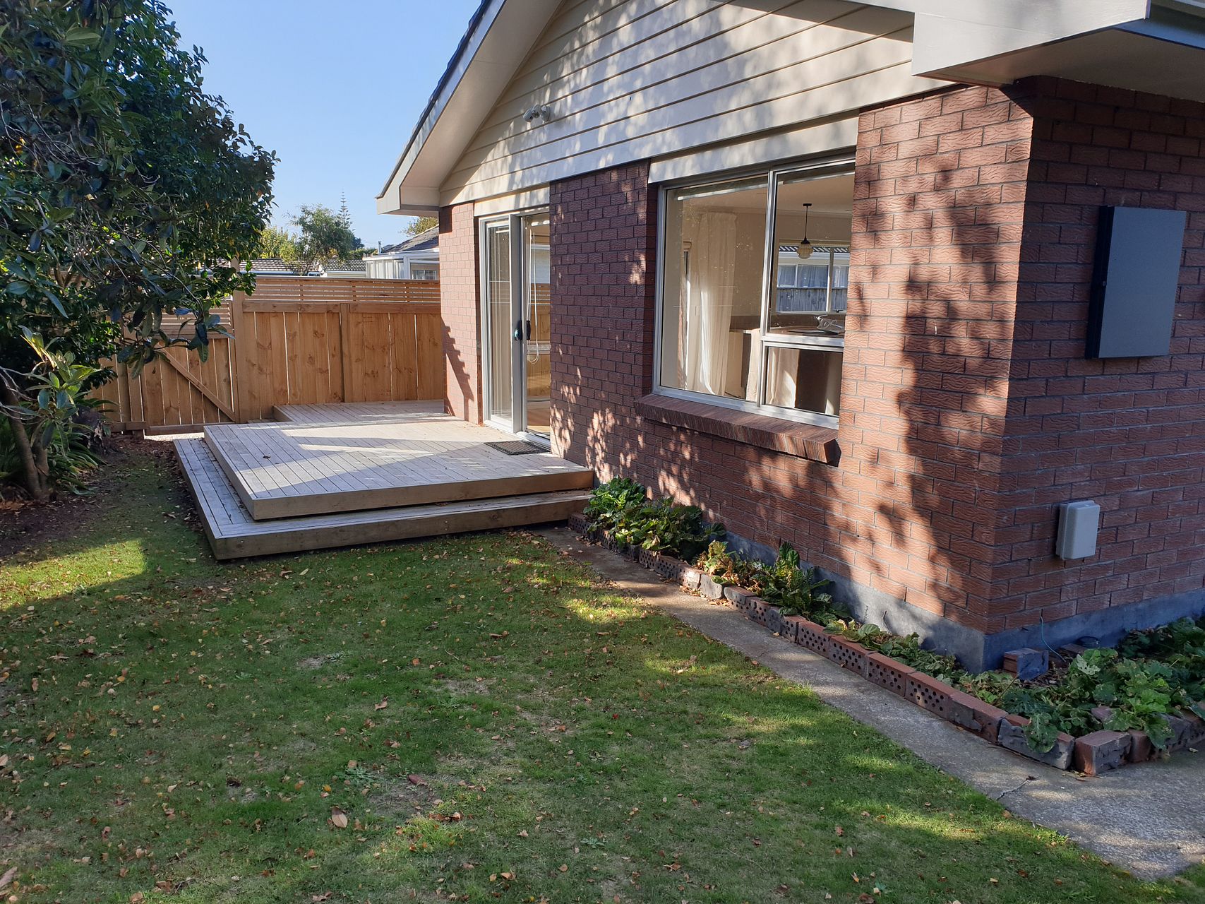 Small but private garden with a deck and lawn, and separate garage.