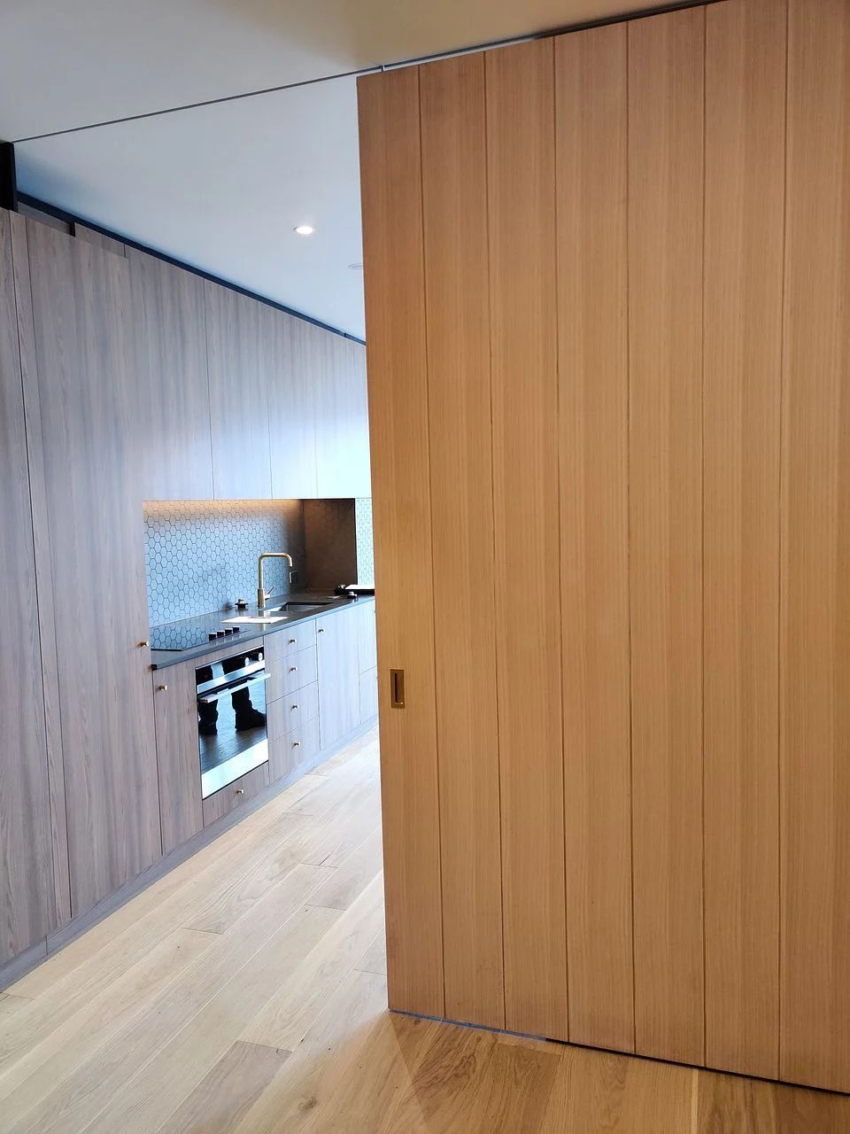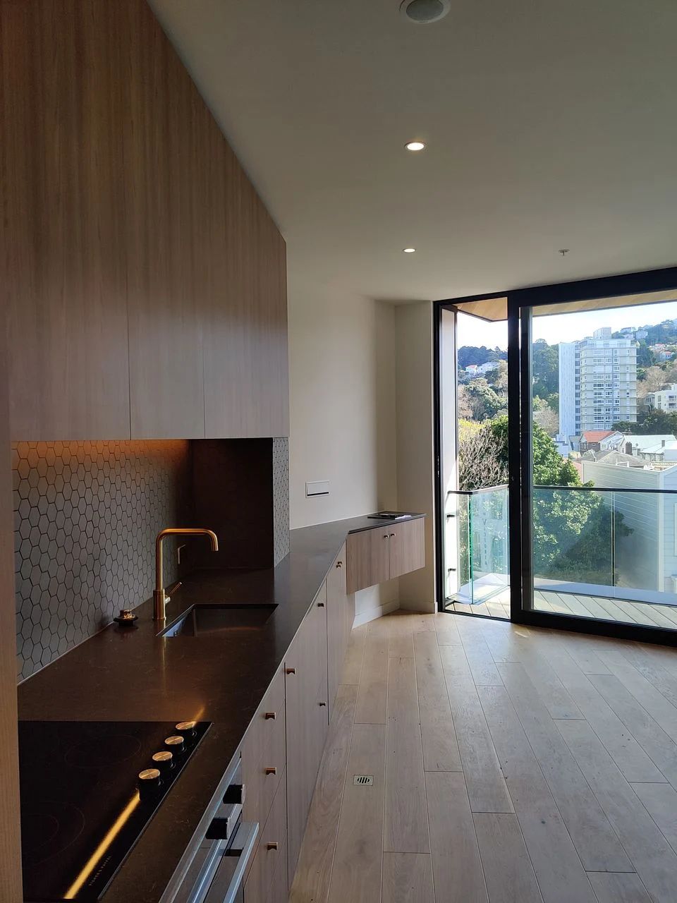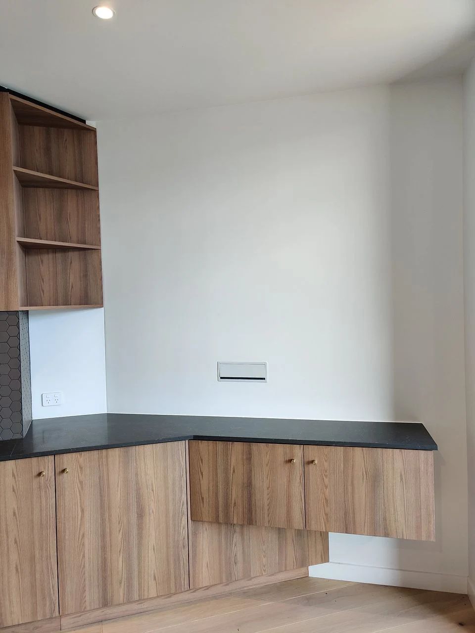 • Oak floors, stone benchtop, brushed brass fittings, Italian tiles