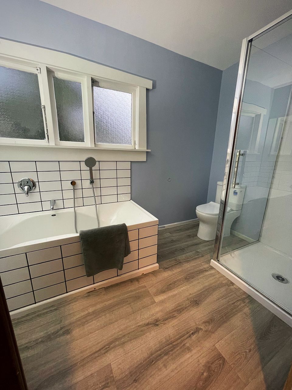 - Modern bathroom with separate shower, large bath and toilet