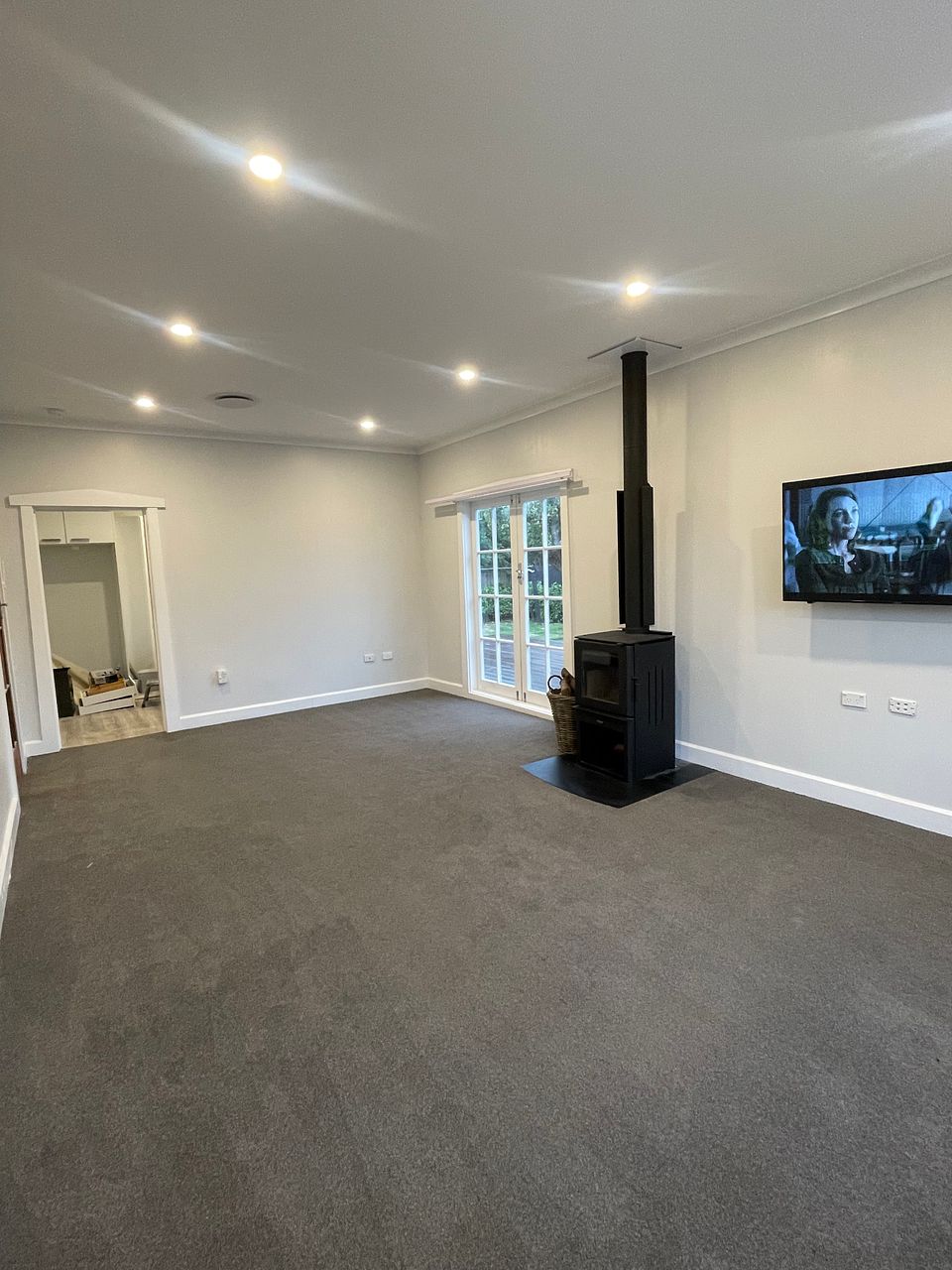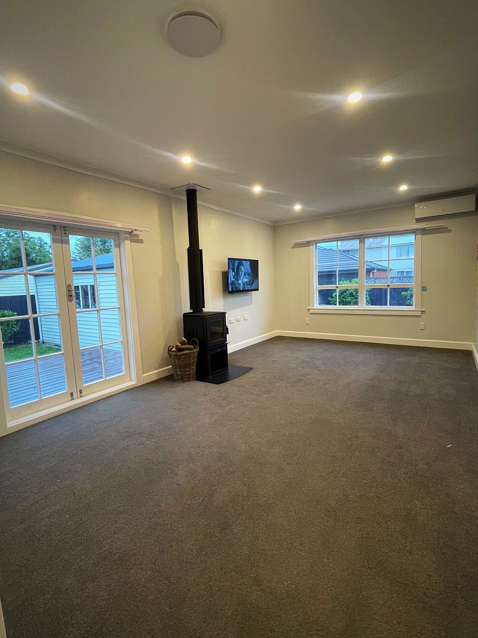 An open planned dining / living area has a new Masport ULEB wood burner and heatpump and flows outside onto a entertainers deck via french doors.