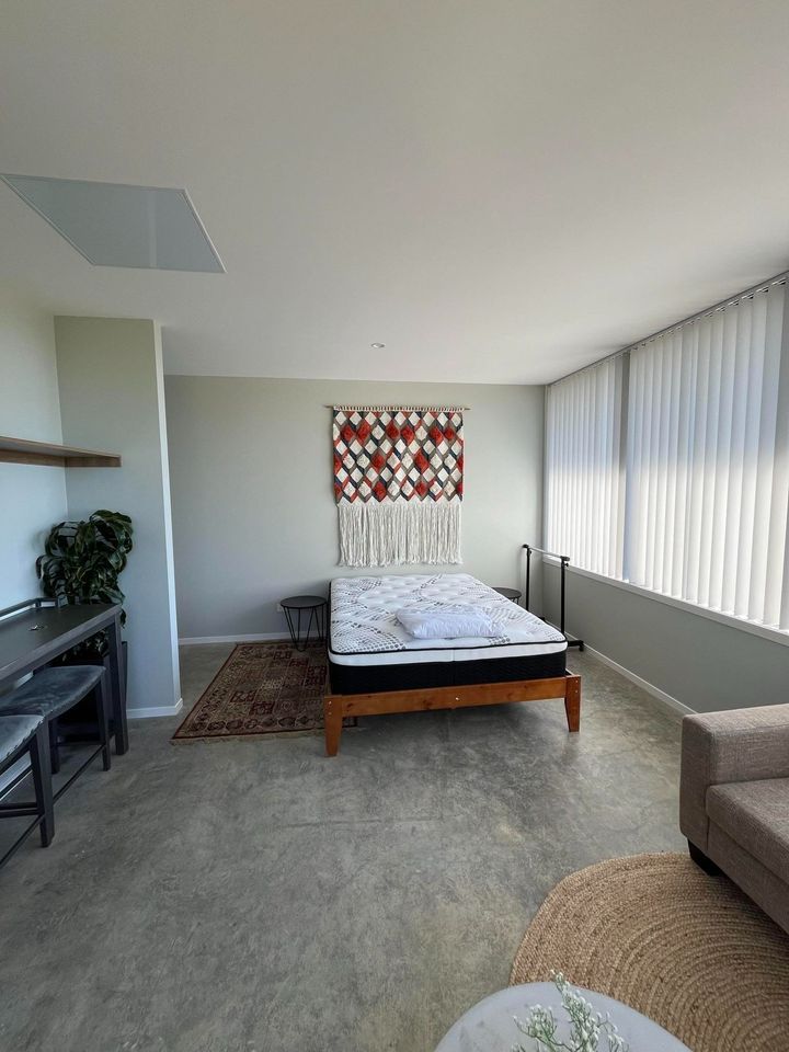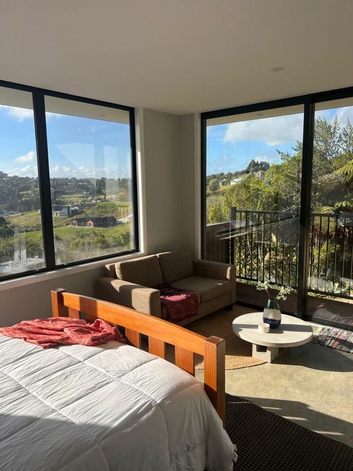 The highlight of the studio is it's large windows and ranch-sliders, overlooking native bush and letting in plenty of natural light. With concrete floors and double-glazing it is warm and cosy.