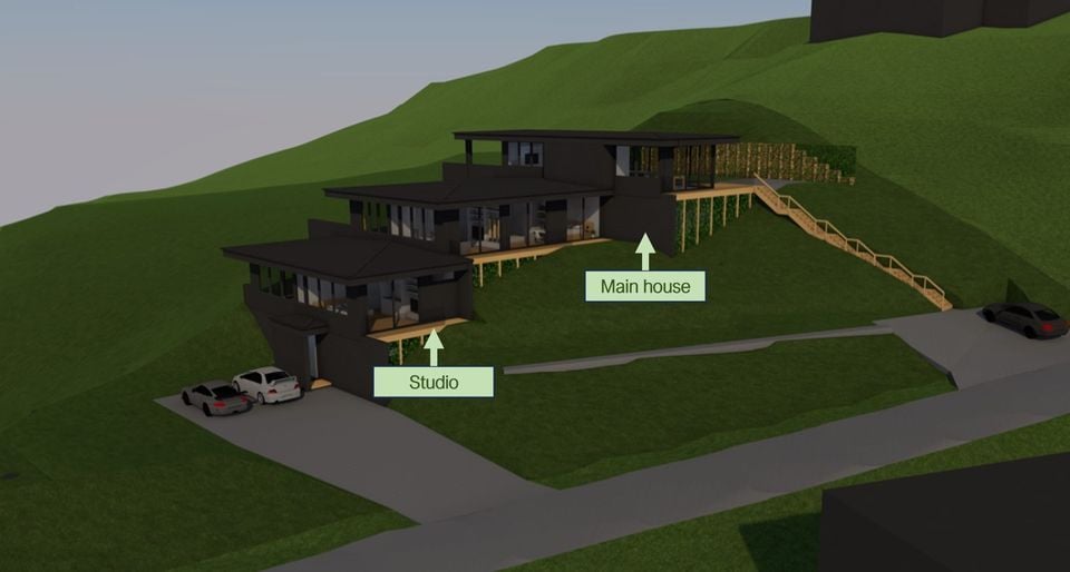 The house itself is over three separate levels, and the studio is on its own (lowest) level.