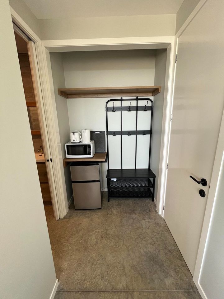 This new build property is set on 5000 square meters of native bush. The studio has an open plan bedroom/lounge area, wardrobe space and a small food preparation area. It does not include a fixed cooking source, however there is bar-sized fridge/freezer, microwave, kettle and toaster already there and you can bring an electric pan (or other appropriate appliances) should you wish. The ensuite is luxurious with a spacious vanity and walk in shower.