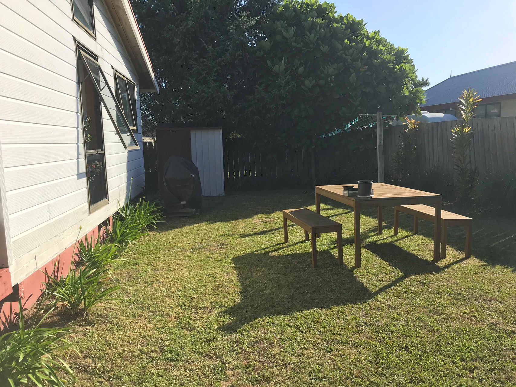 Fully furnished includes beds, bedside tables, bookshelves, new flat screen Smart TV, TV cabinet, dining table and chairs, large leather L sofa, fridge, microwave, all utensils and cooking items and more. Outside there will be a large outdoor table, umbrella, chairs, lawnmower etc.