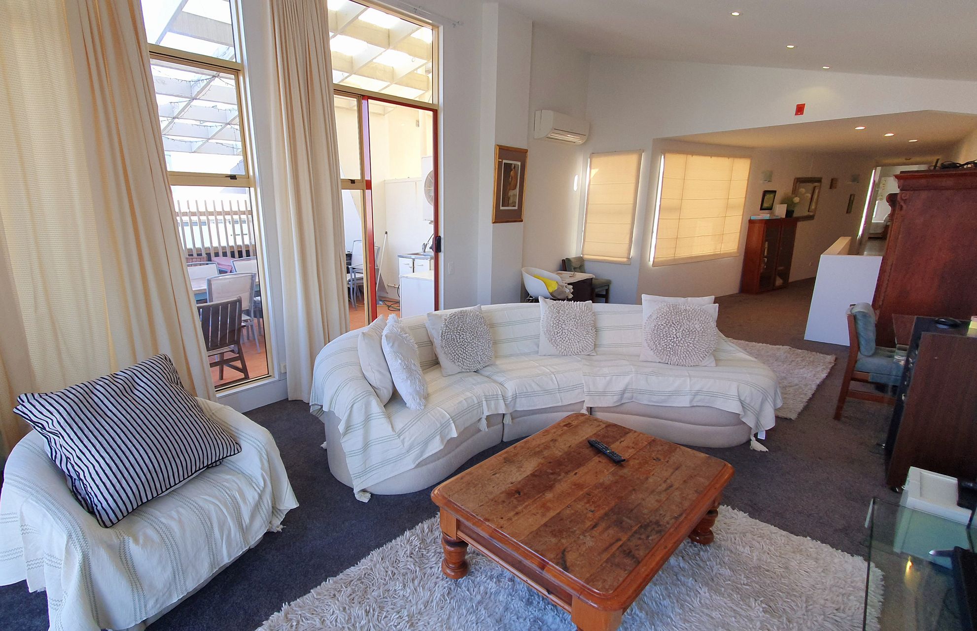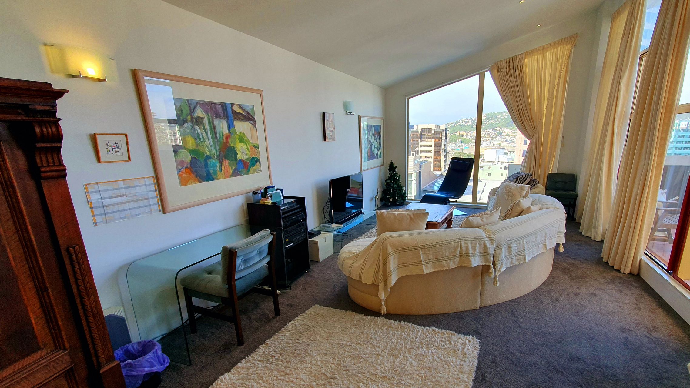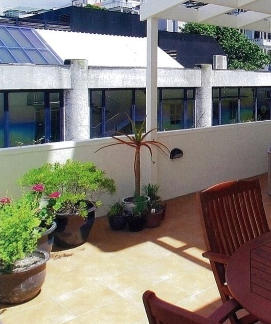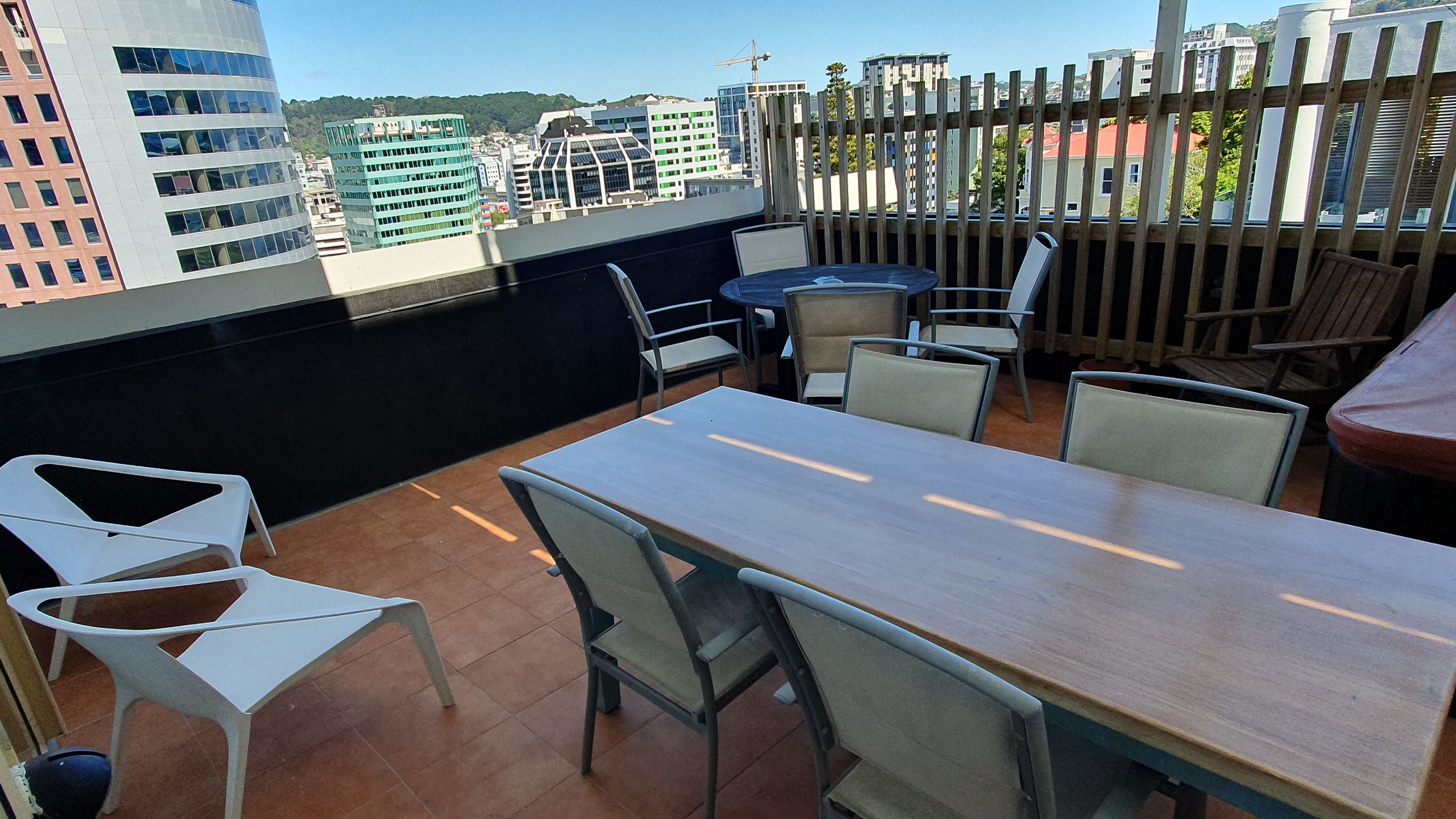 Large deck with furniture and views over the central city.