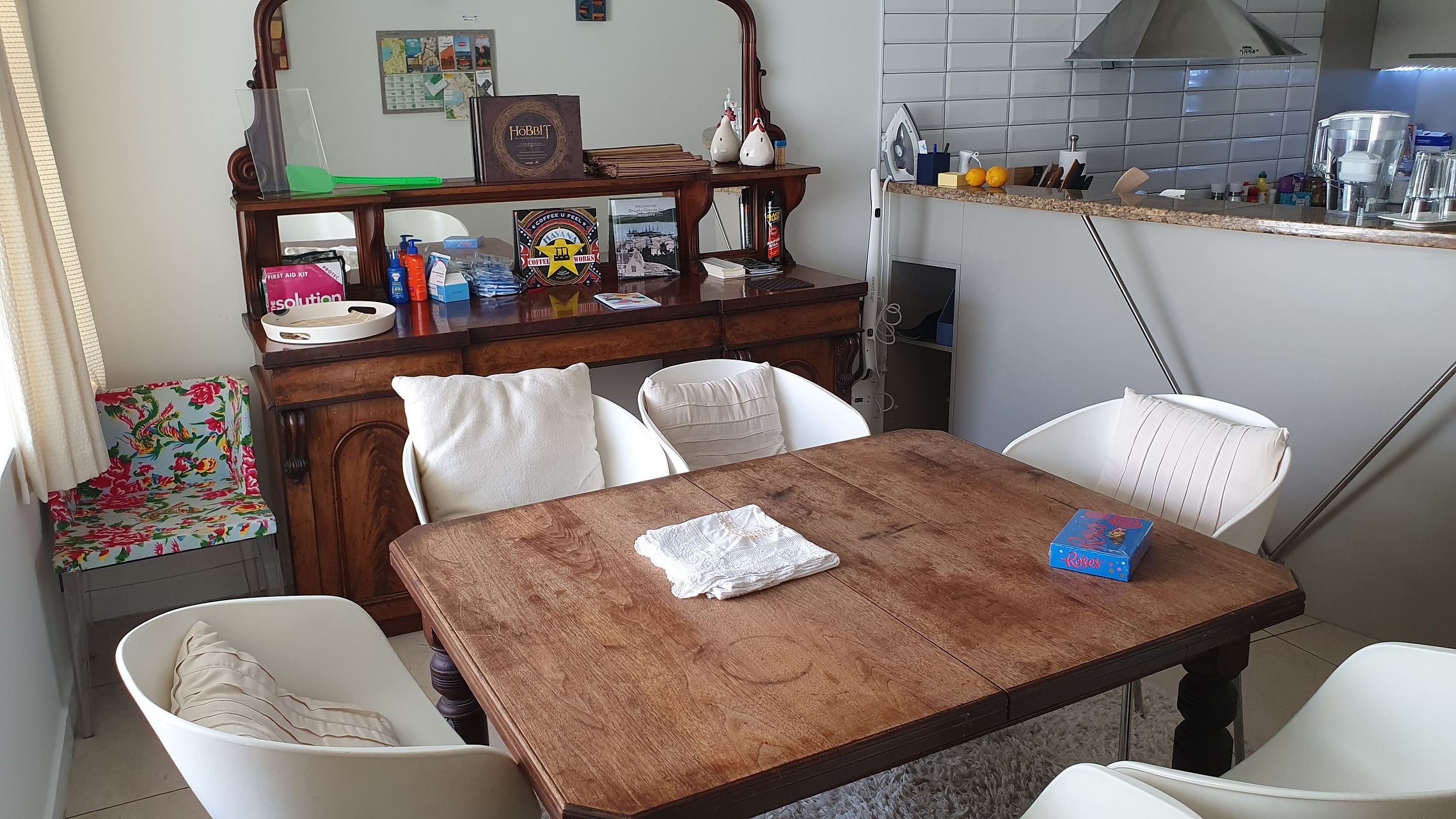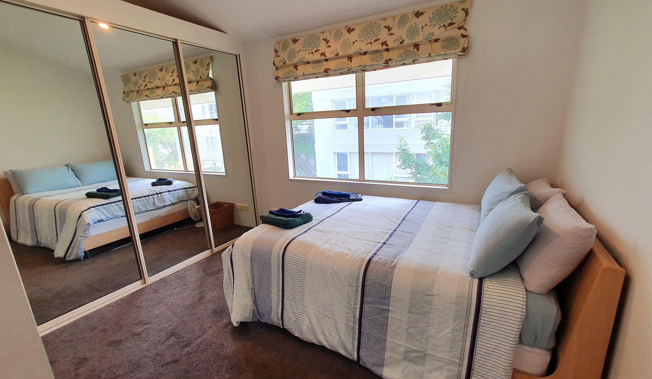 The bedroom has an ensuite, and a large wardrobe covering 1 wall, and a dressor. It is next to the kitchen and living areas, upstairs.