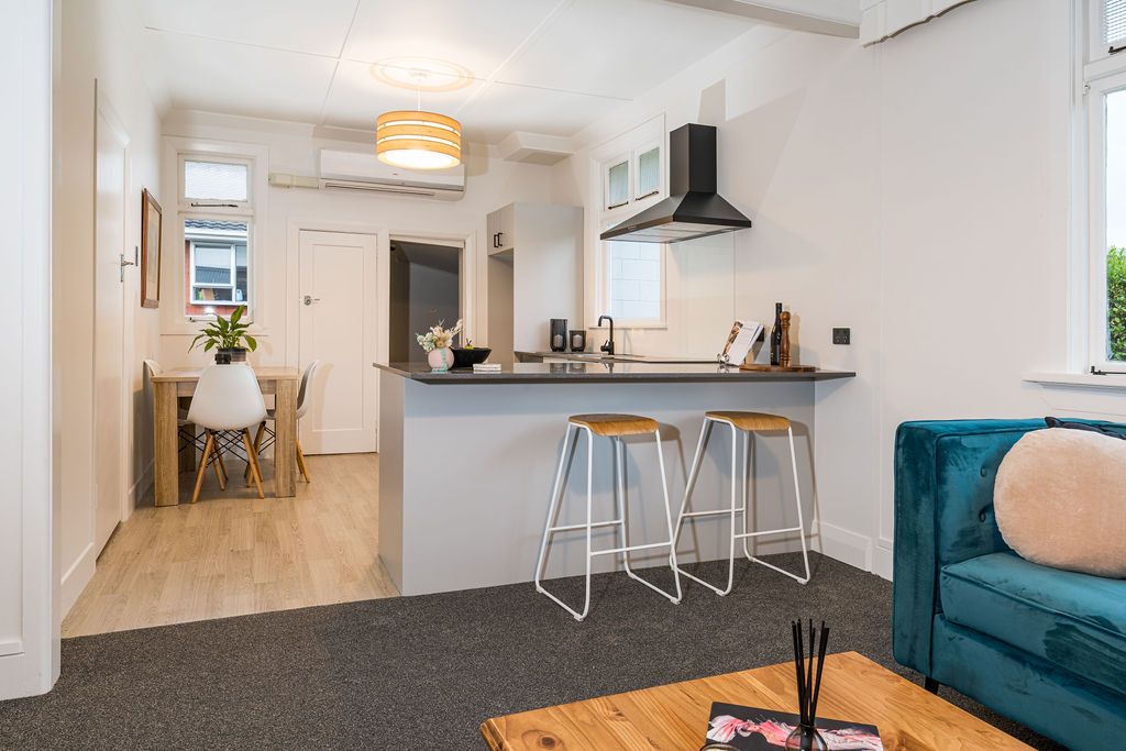 The spacious living area is open plan with a heat pump. The kitchen includes a breakfast bar and has been updated to include an engineered stone bench and new appliances.