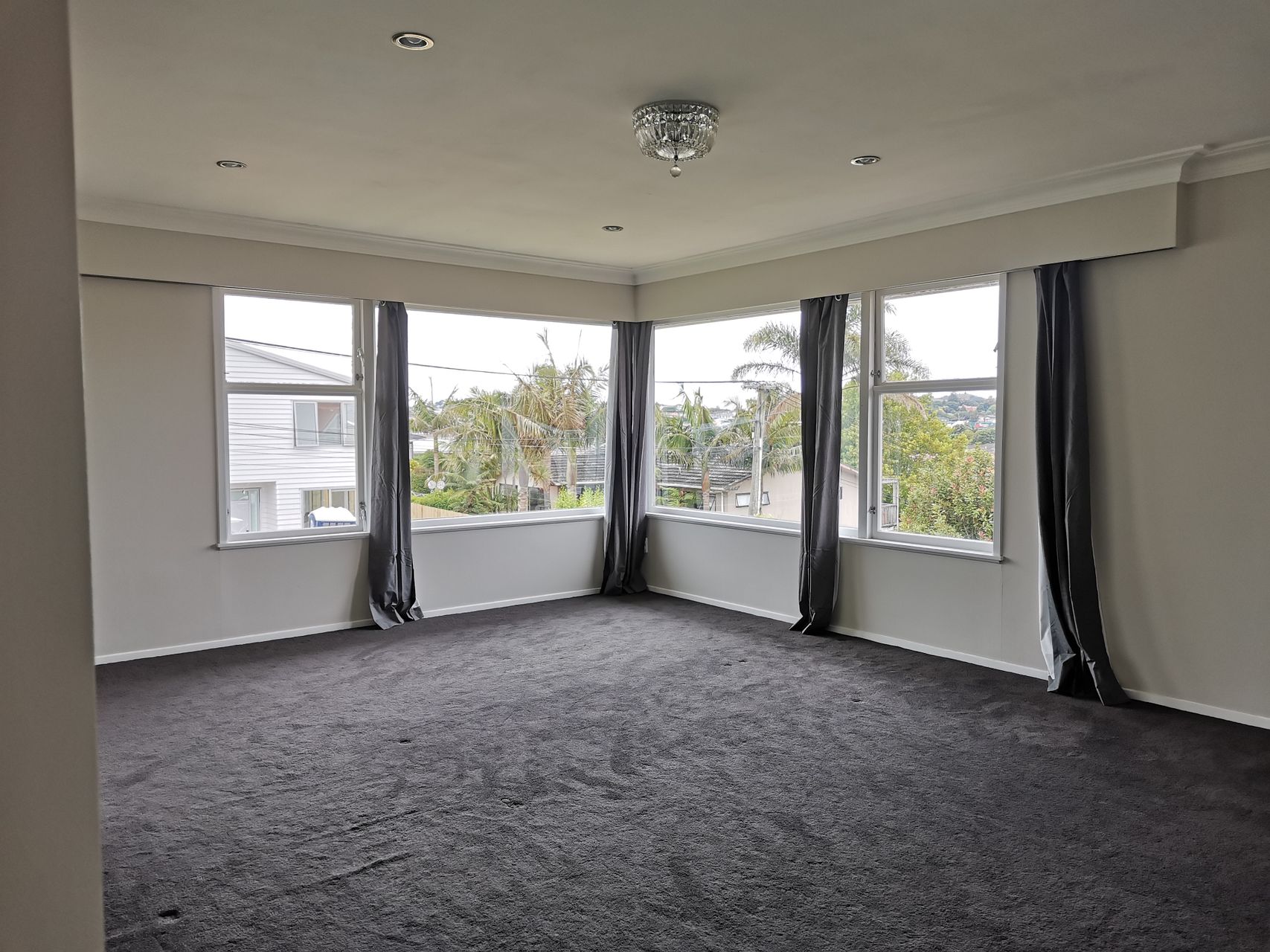 Spacious upstairs lounge with pleasant views facing one tree hill, Sky Tower opening into a large balcony.