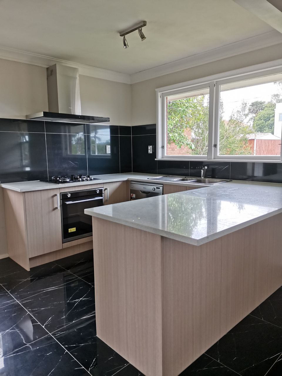 Open plan kitchen with a granite bench top and separate dining area. Furnished with a dishwasher, oven, gas hobs and range hood.