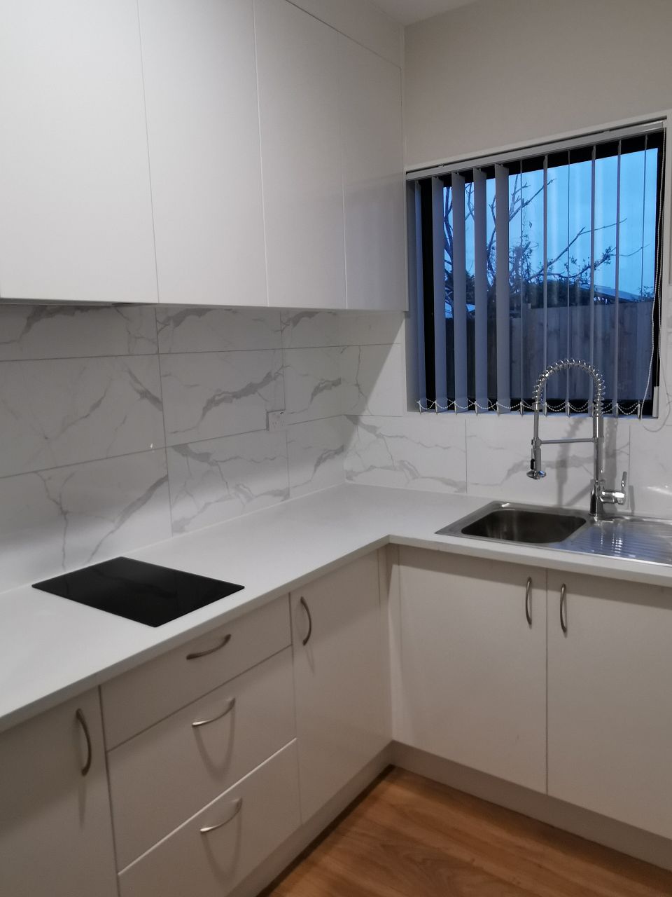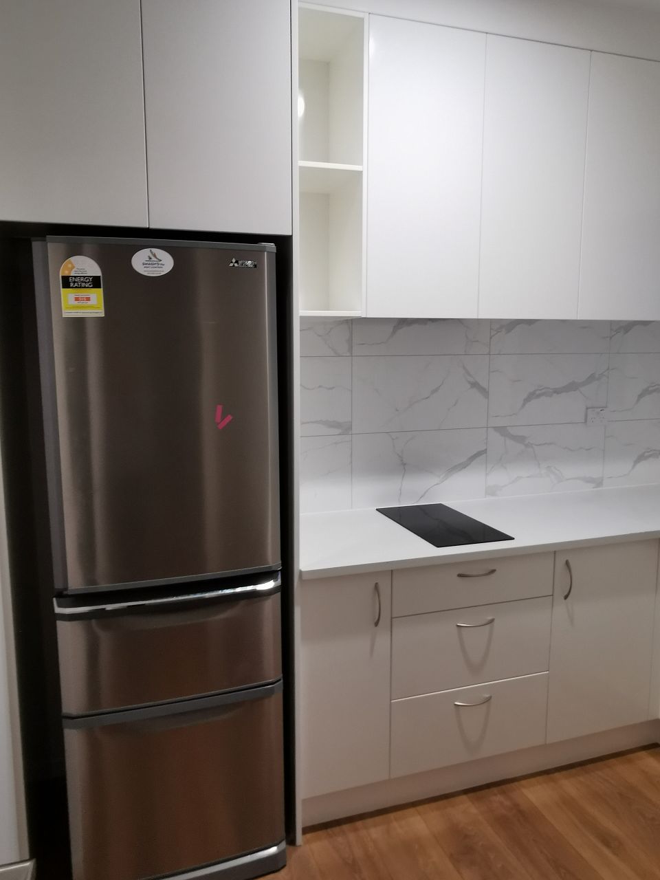Kitchen is well furnished and equipped with a good size fridge, sink, induction stove, and rangehood to keep up with a healthy lifestyle.