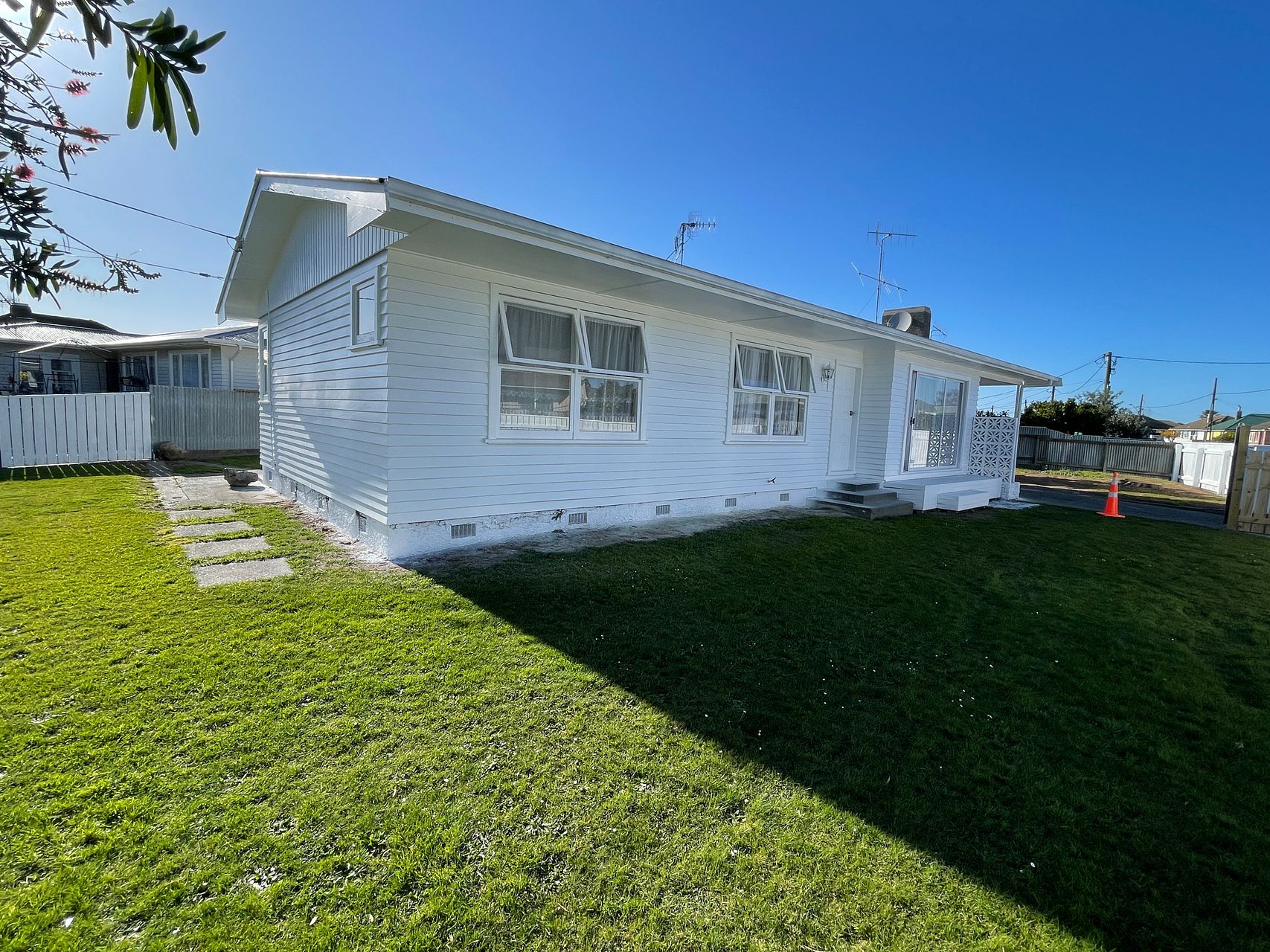 Pet and family friendly, sunny 3 bedrooms 1 bathroom house at corner of Charles Corner, Maraenui. Good location, fully fenced, low maintenance, plus two storages / sheds. Citrus tress in front garden. Large section for kids and pets to run around.
