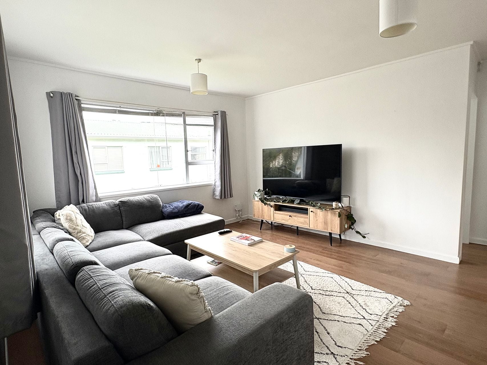 - Neutral, modern décor throughout with wood-look flooring in the living area, white walls and grey carpet in bedrooms