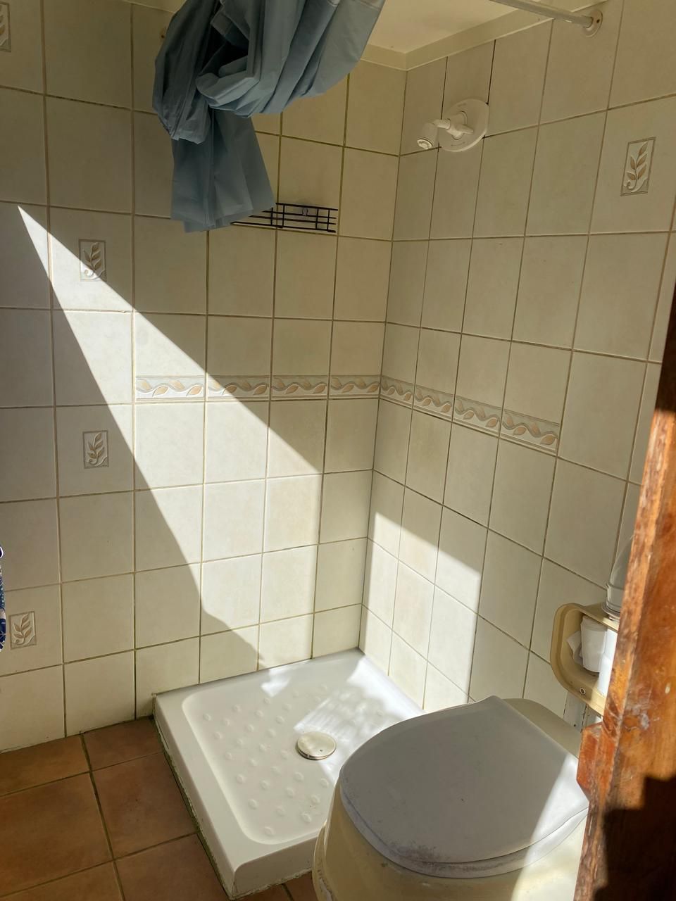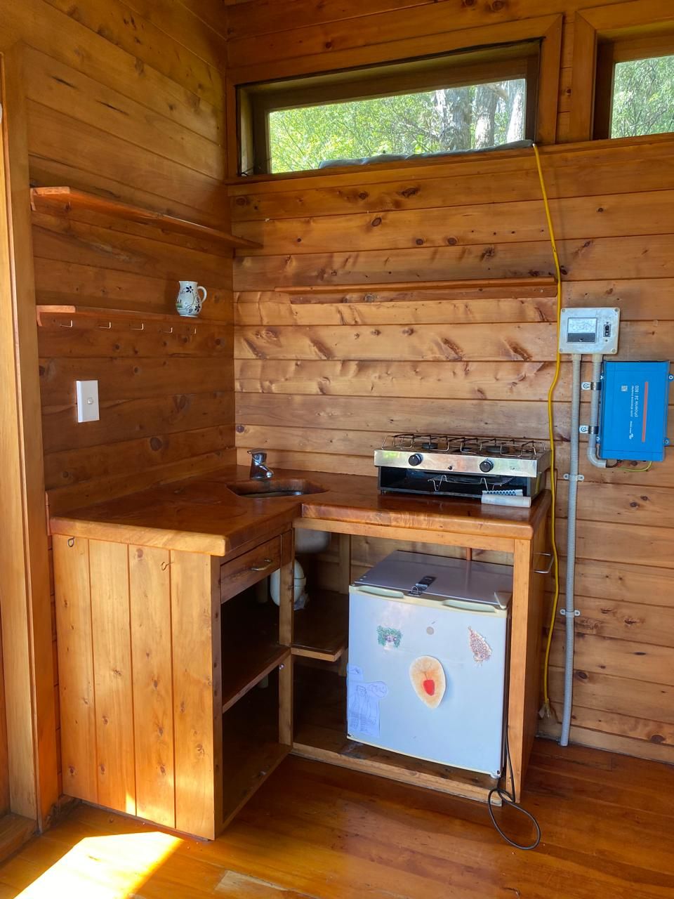 - Bathroom features shower and a compost toilet.