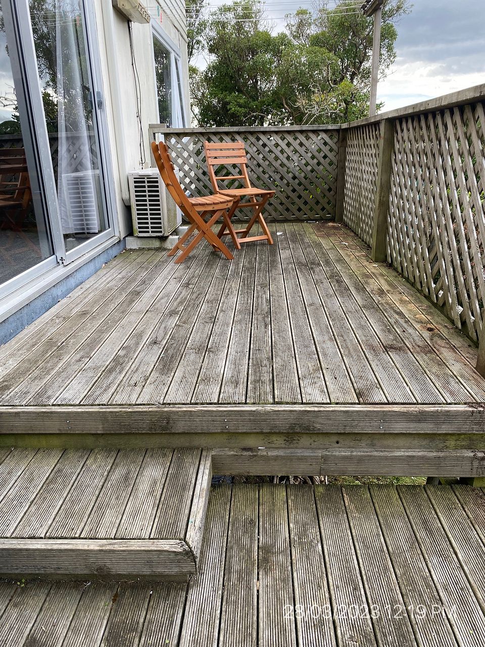 One off street car park. Deck with some outdoor furniture and a couple of washing lines available. Three bedroom upstairs.