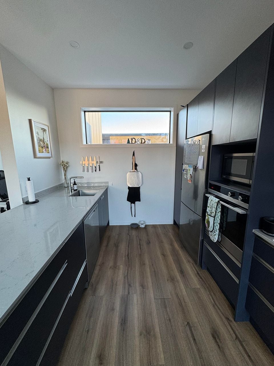 - Large kitchen with Fisher & Paykel (dishwasher, oven, and induction cooktop) and LG (fridge/freezer) appliances and expansive benchtop.