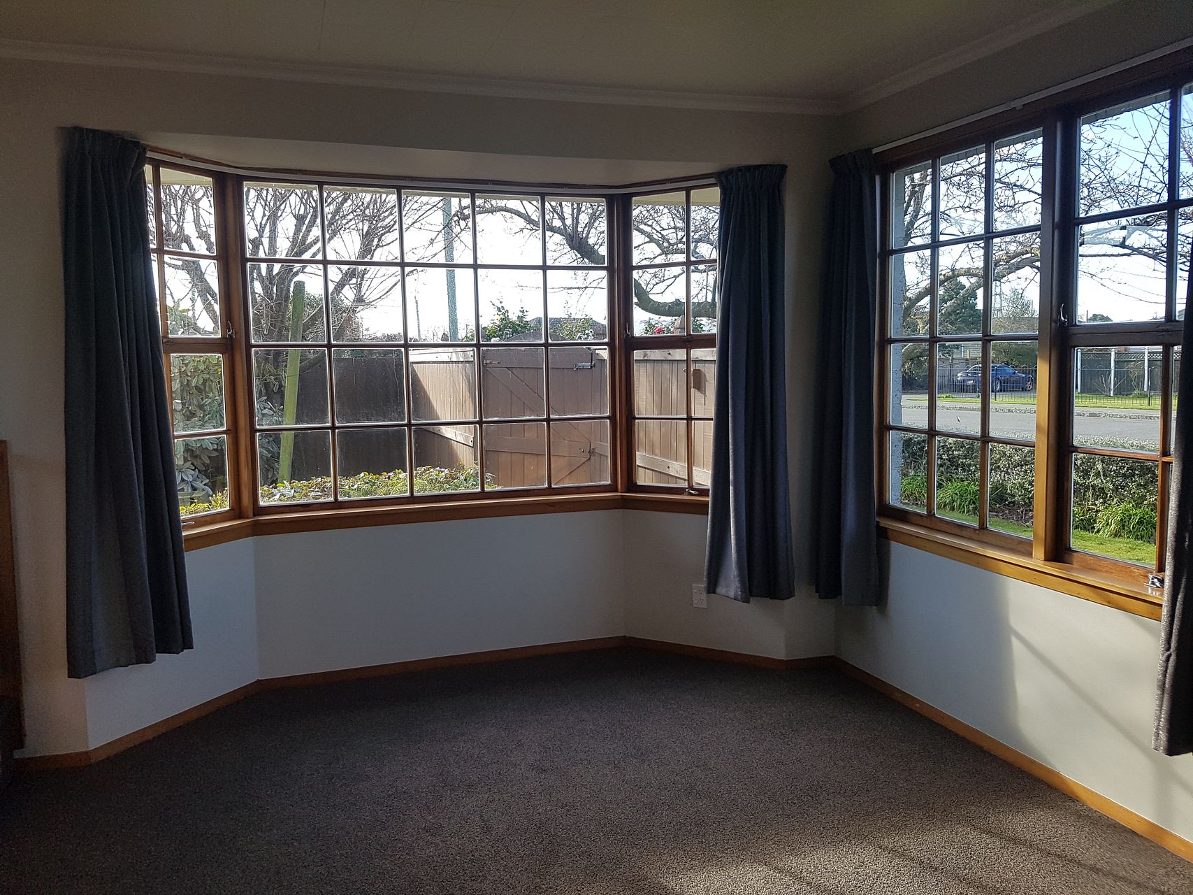 Fully-fenced yard with established trees and plants.