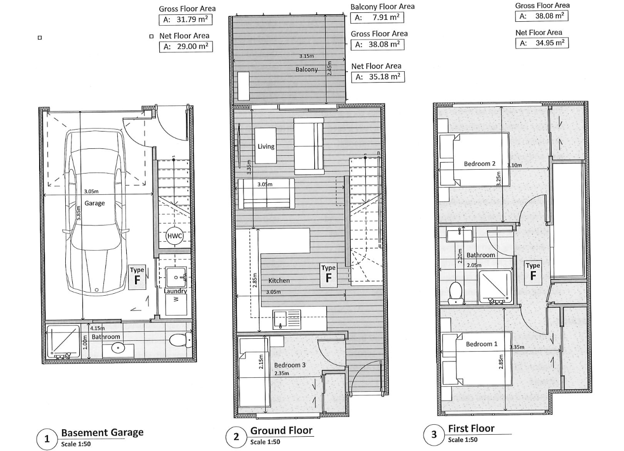 Middle floor: Combined kitchen, dining, and living area, plus a small third bedroom, deck, and access to the fully fenced backyard (with space for a trampoline if desired).