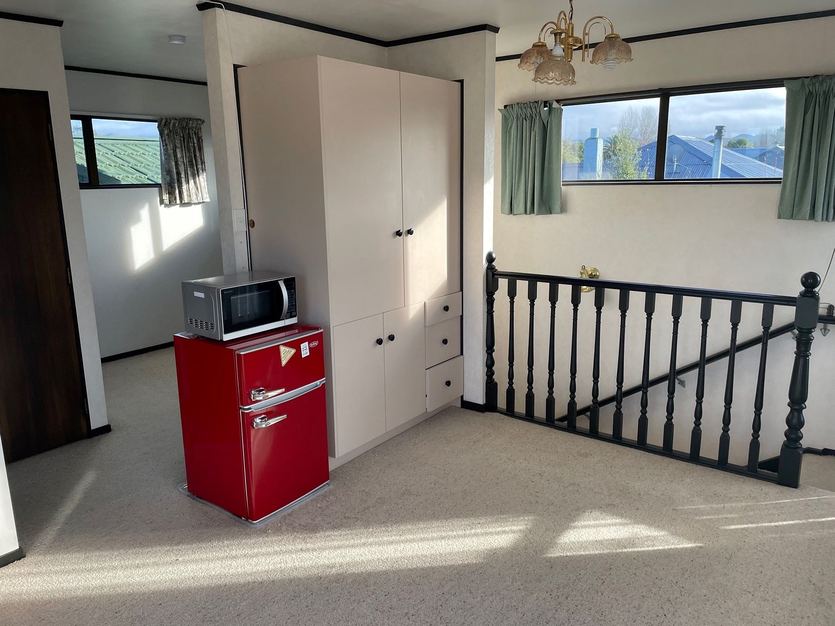 - Open plan kitchen & living area. Kitchen has no oven.